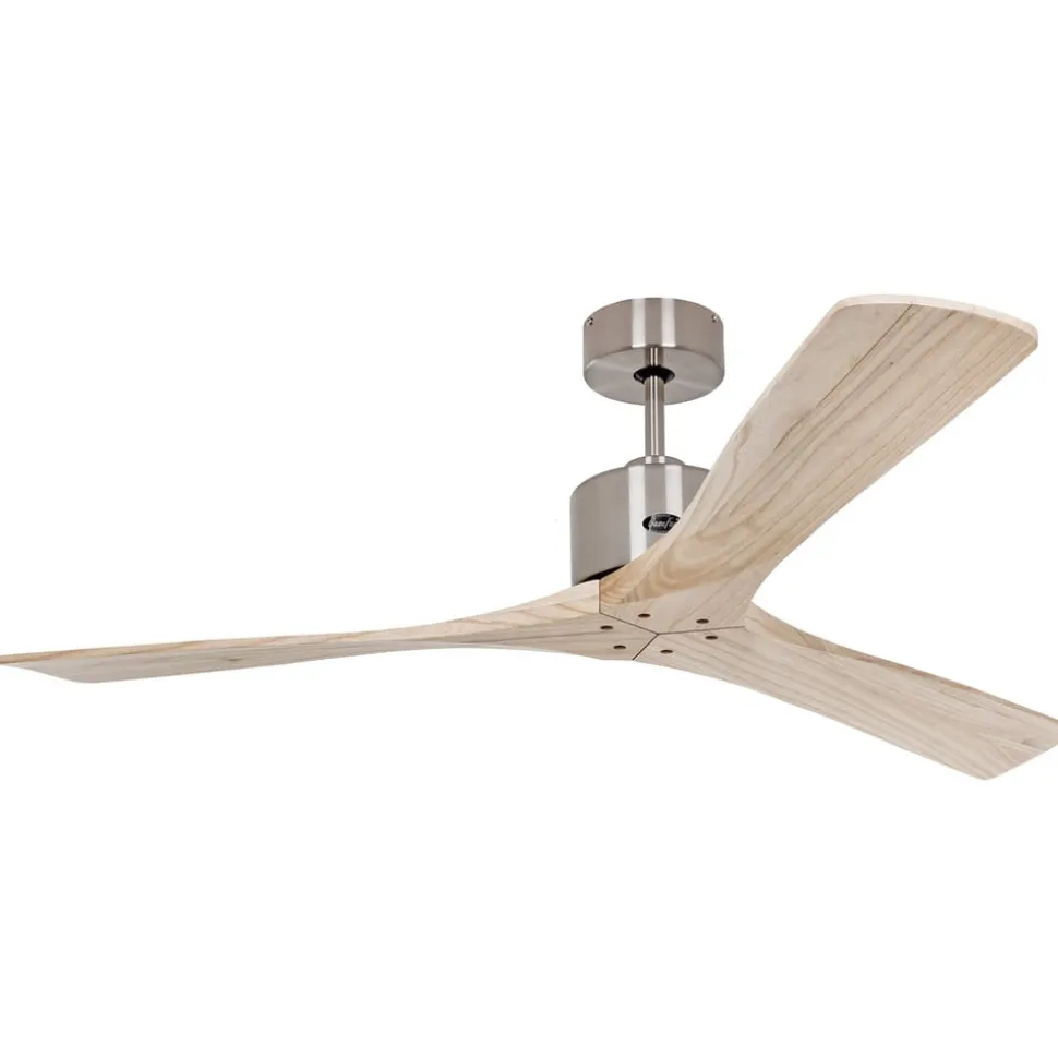 Fjernbetjent loftsventilator Macau med tre træblade og dæksel i børstet kromlook Loftsventilatoren kombinerer et moderne design med et naturligt præg, som opnås med de tre blade af ægte træ. Loftsbeslaget og motorenheden er lavet af stål med en finish i børstet krom. Afbalanceringen af de roterende komponenter sikrer lydløs drift. Funktioner Macau aktiveres, og et af de tre hastighedsniveauer vælges ved hjælp af fjernbetjeningen, som der medfølger et passende vægbeslag til. En skyder bruges til at ændre retningen til sommer- eller vinterdrift. Sidstnævnte skaber en omfordeling af den varme luft, der akkumuleres under loftet, mod opholdszonen, hvilket resulterer i potentielle besparelser på varmeomkostningerne. Tekniske data – Fremad- og bakfunktion – Afbalanceret motor og blade – Vægt: 7,5 kg Effekt pr. hastighed: – 21 W ved 95 o/min – 34,4 W ved 130 o/min – 42,1 W ved 159 o/min