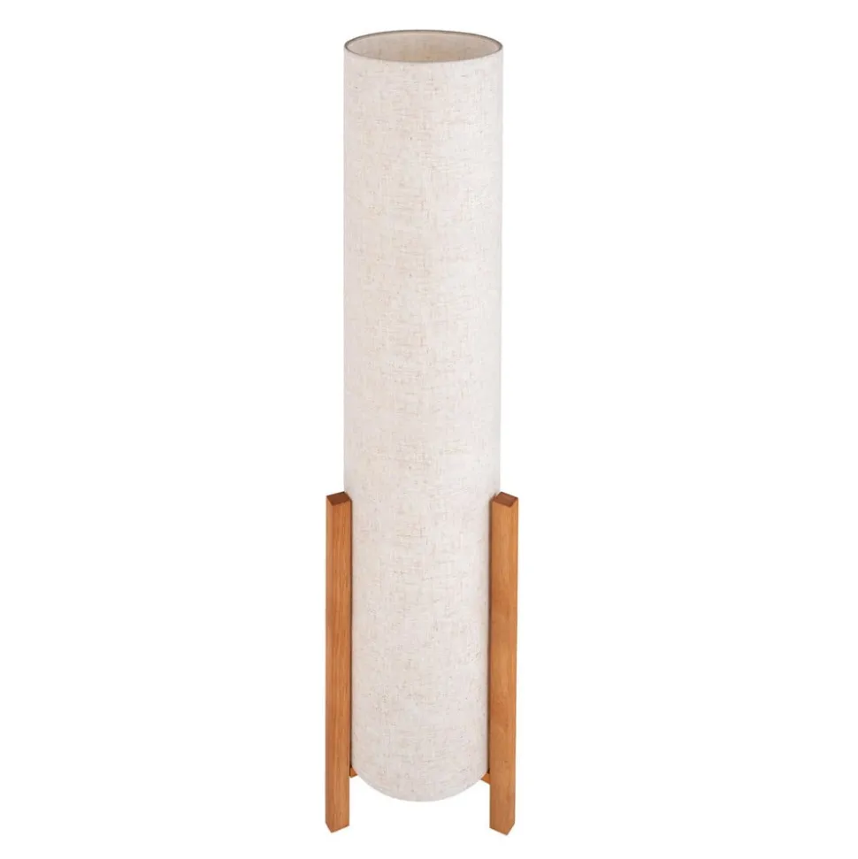 Matilda gulvlampe med træstel og stofskærm i hørlook Matilda gulvlampe bringer naturlighed ind i ethvert rum. Lampen med et trebenet stel af lyst træ og en cylindrisk skærm af stof i hørlook på indersiden skaber hyggelig belysning i stuen eller soveværelset. Den er udstyret med en 200 cm lang ledning og kan monteres med tre pærer med en E14-sokkel på op til 25 W