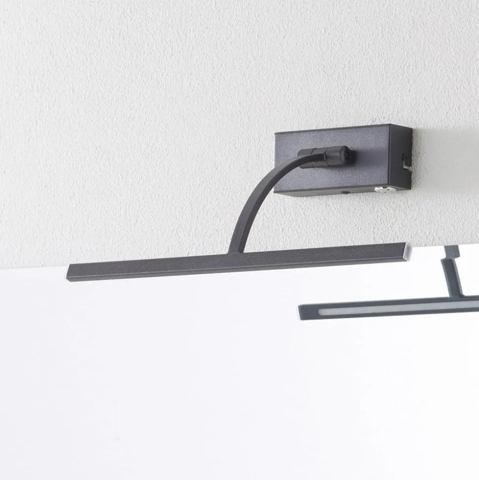 Dæmpbar Matisse LED-væglampe med bevægelig arm Den moderne og tidløse Matisse LED-væglampe er ideel til belysning af malerier eller spejle. Den fremspringende arm, som et aflangt, smalt armaturhoved er fastgjort til, kan bevæges op og ned. Det gør det nemt at justere ikke bare højden, men også lysstrålens retning. Lyset udsendes direkte over hele længden og skinner i en varm hvid farve. En afbryder er integreret i det vinklede vægbeslag. Den kan bruges til at tænde eller slukke for lyset. Den har også en lysdæmper, som husker den sidst valgte indstilling takket være hukommelsesfunktionen.
