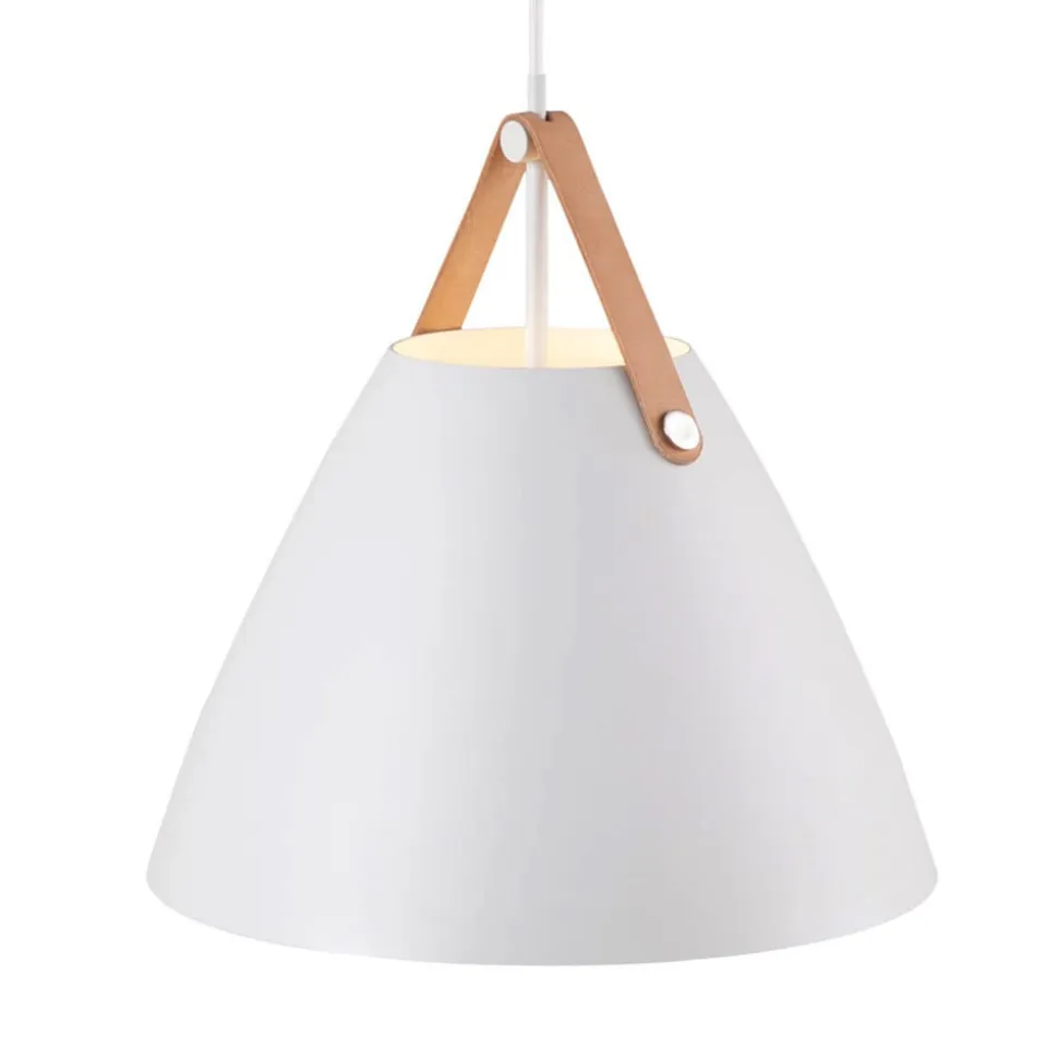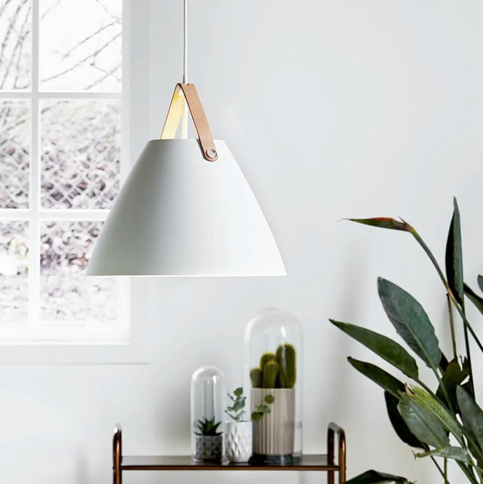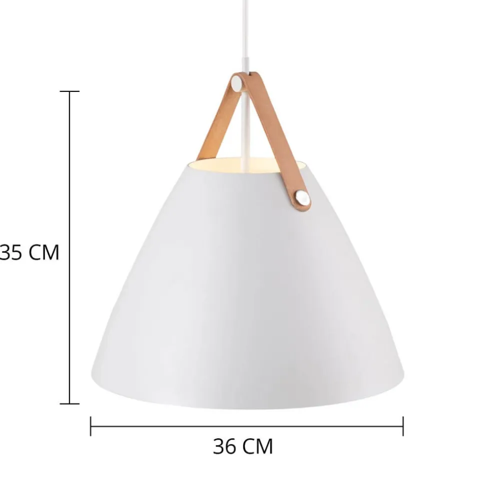Hvad der er specielt ved Strap 36 LED-pendellampen, er dens ophæng. Den hvidlakerede metalskærm kan fastgøres med enten en sort eller brun lædersnor, idet lampen leveres med begge, hvormed der kan skabes et individuelt udseende. Takket være det 3 meter lange tekstilkabel kan pendellampen placeres mange steder, inklusiv i rum med høje lofter. For at oplyse spisebordet, bordet eller disken i køkkenet på en energibesparende måde, skal der anvendes en E27 LED lyskilde (se tilbehør).