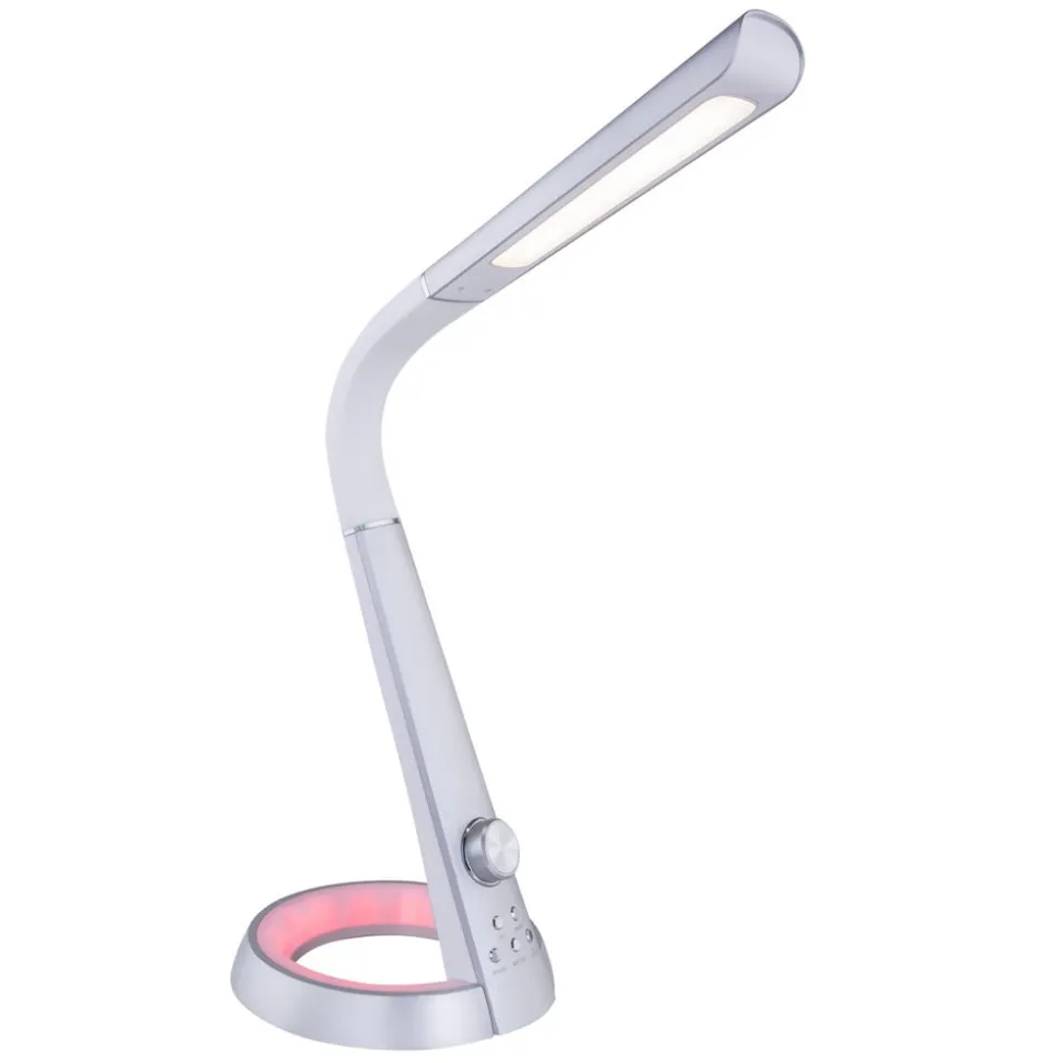 Mitti LED-bordlampe med USB-tilslutning og mange praktiske funktioner Mitti LED-bordlampen er en rigtig allrounder og er især velegnet til brug på kontoret, men er også ideel til brug på børne- eller teenageværelset. Lampen har en fleksibel arm, der kan justeres individuelt. Den integrerede dæmpningsfunktion regulerer lysstyrken, og det er også muligt at variere lysfarven fra varm hvid til dagslys hvid. I basen er der indbygget en RGB-lyskilde, som lyser op i klare farver og kan bruges som et behageligt natlys. Den integrerede USB-port er særlig praktisk og kan bruges til at oplade smartphones eller tablets med et tilhørende USB-kabel.