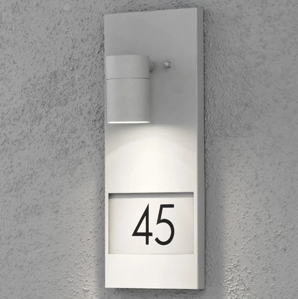 Modena 7655 er en husnummer- og udendørs væglampe i én. Det enkle design understreger den moderne fremtoning. En lille spot belyser cifrene nedenunder. Levering omfatter tal (3 x 0-9).