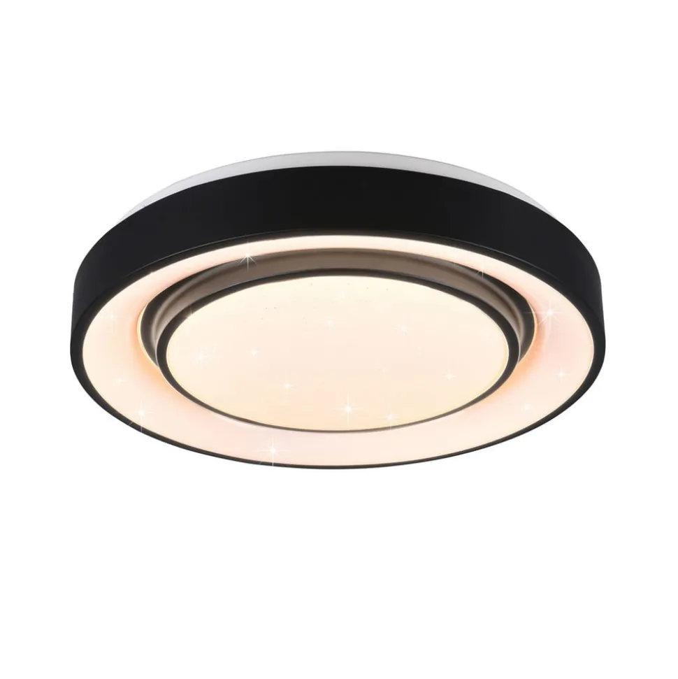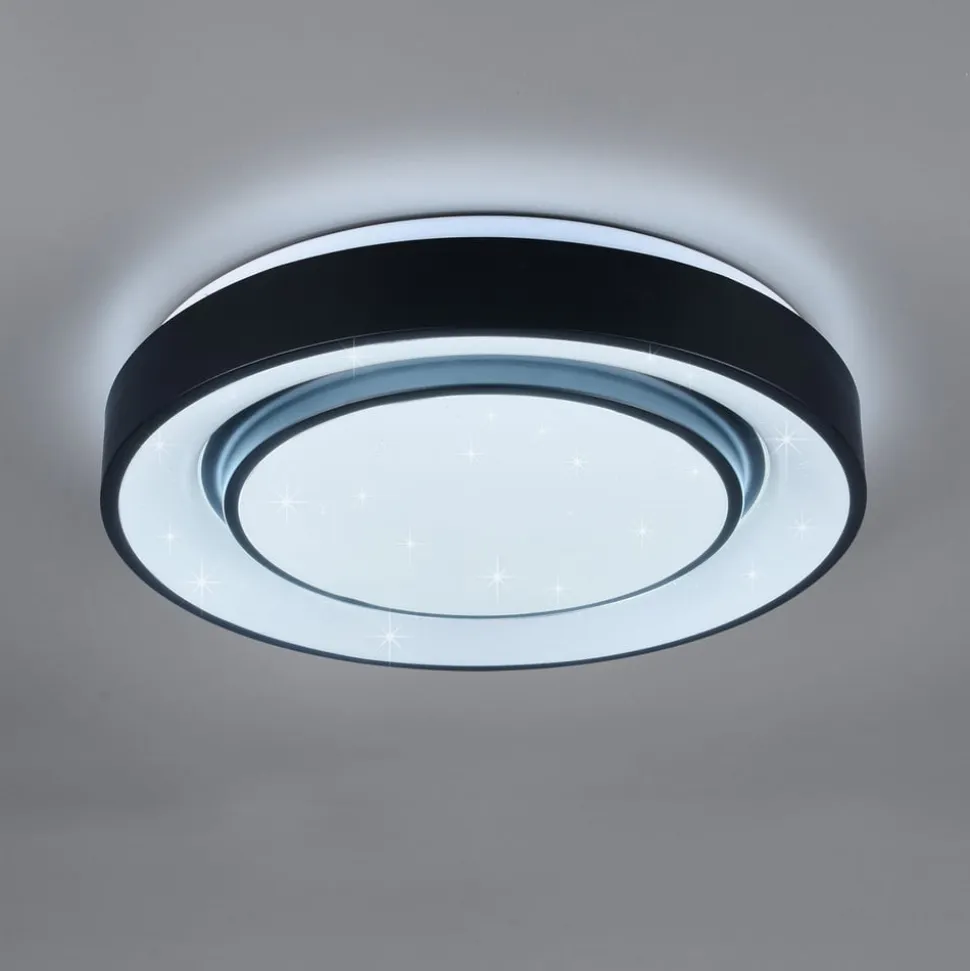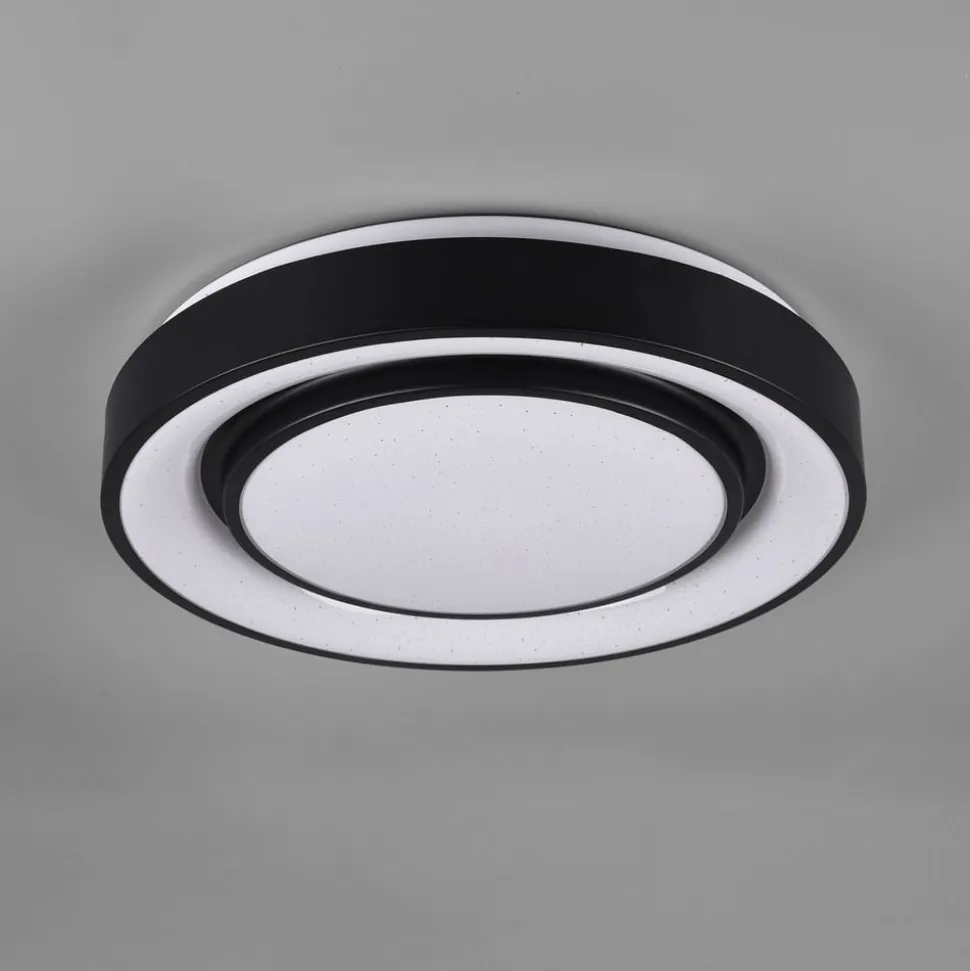 LED-loftlampe Mona er optisk opdelt i to lyskilder – en let fremspringende indre cirkel og en ydre ring, hver omgivet af en sort ramme lavet af metal. Den matte plastdiffusor giver en bestemt noget med en stjernelyseffekt for at bringe lyset i fokus. Den variable belysning, der er skabt af RGBW- farveskift, justerbar farvetemperatur, hukommelsesfunktion, nattelys og dæmpbarhed, lader intet tilbage at ønske. Armaturet sikrer således optimale lysforhold, en behagelig atmosfære og kan integreres i adskillige moderne indretningskoncepter.