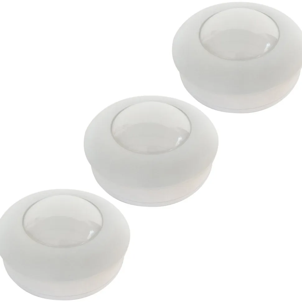 De tre runde LED-lamper Alio Push fastgøres på skabe, hylder eller andre glatte overflader ved hjælp af magnetiske klæbestrimler. De er batteridrevne og kræver 9 AA-batterier (medfølger). De tre lys kan tændes og slukkes med den medfølgende fjernbetjening.