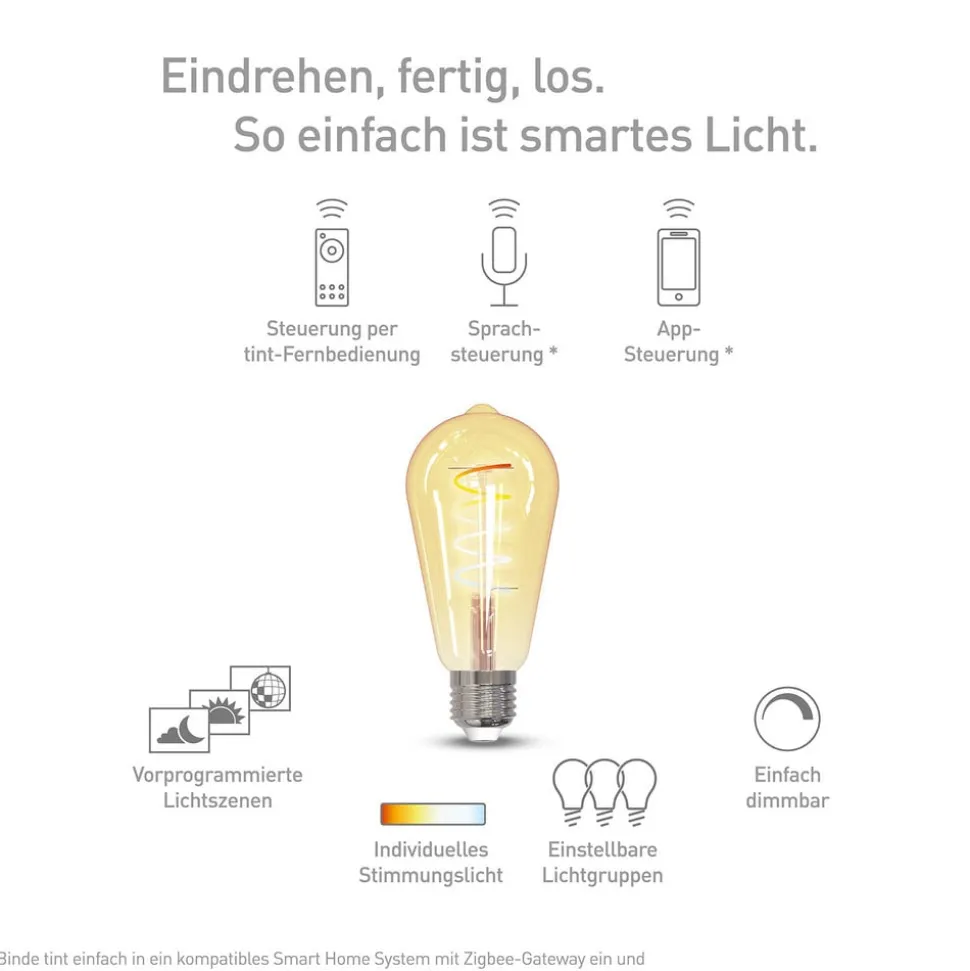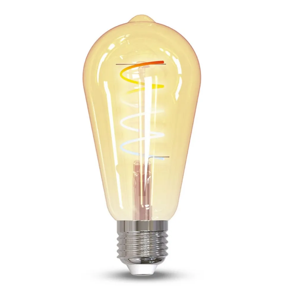 Dekorativ og smart styrbar – den moderne LED-lampe med E27-fatning giver et stemningsfuldt lys fra varm hvidt til dagslys. Kan styres på forskellige måder, f.eks. via en fjernbetjening, en stemmeassistent eller en app.