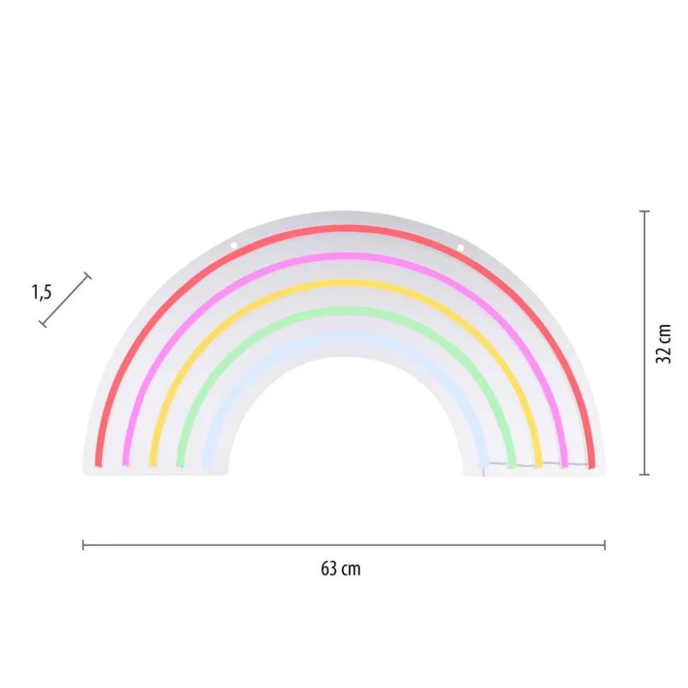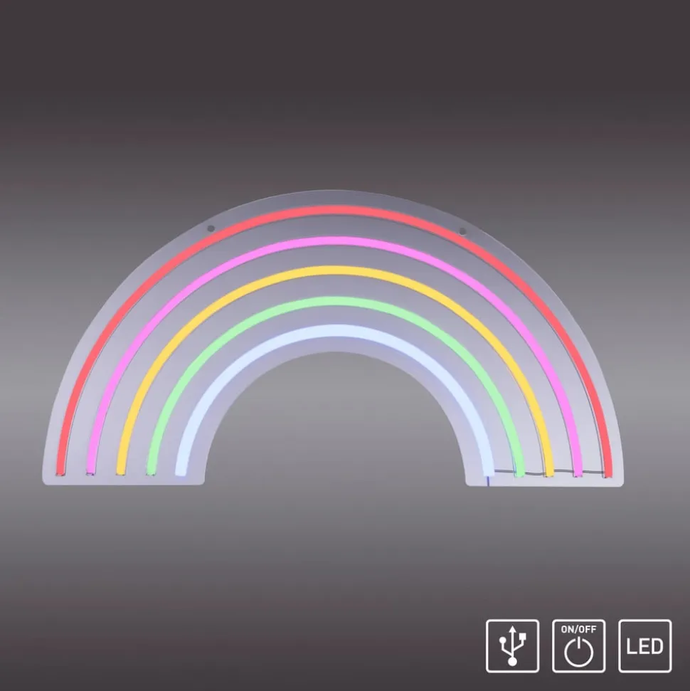 LED-væglampe Neon Rainbow, USB LED-væglampen Neon Rainbow er lavet af plastik og har, som navnet antyder, form som en farverig regnbue. Et LED-modul er integreret som standard. Denne dekorative væglampe betjenes via USB. Et USB-kabel med USB-A-stik (uden strømforsyning) og kontakt (tænd/sluk) er permanent installeret.