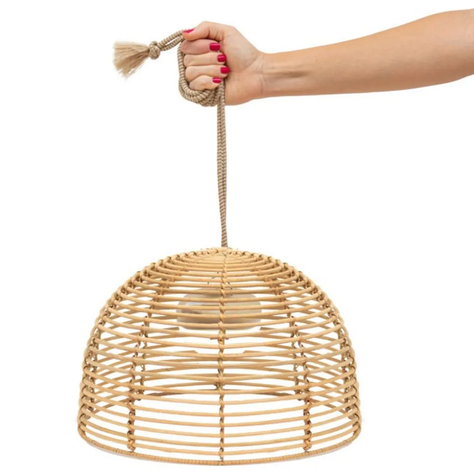 Batteridrevet Bossa LED-hængelampe med rattan-skærm Bossa LED-hængelampen har en meget naturlig og effektiv effekt takket være den lyse rattan-skærm og den lange ophængningssnor. Hængelampen kræver ingen installation, men kan hænges frit og hvor som helst udendørs eller indendørs, på et terrassetag, i et træ, under et tag – takket være det genopladelige batteri er der ingen grænser for dens anvendelsesmuligheder. Den medfølgende fjernbetjening kan bruges til at skifte lyset fra den medfølgende pære til tre lysstyrker. Armaturet ser særligt effektivt ud, når det kombineres med flere armaturer fra serien, for eksempel i en strandbar eller et cateringfirma. Lysets varighed er mellem 6 og 20 timer, afhængigt af lysindstillingen. Et USB-ladekabel til opladning af lyset på en powerbank eller via adapter (medfølger ikke) i stikkontakten medfølger – inkl. genopladeligt batteri 1 x 6000 mAh – inkl. micro USB-ladekabel og fjernbetjening – lysvarighed med fuldt batteri op til 20 timer – opladningstid 4 til 6 timer