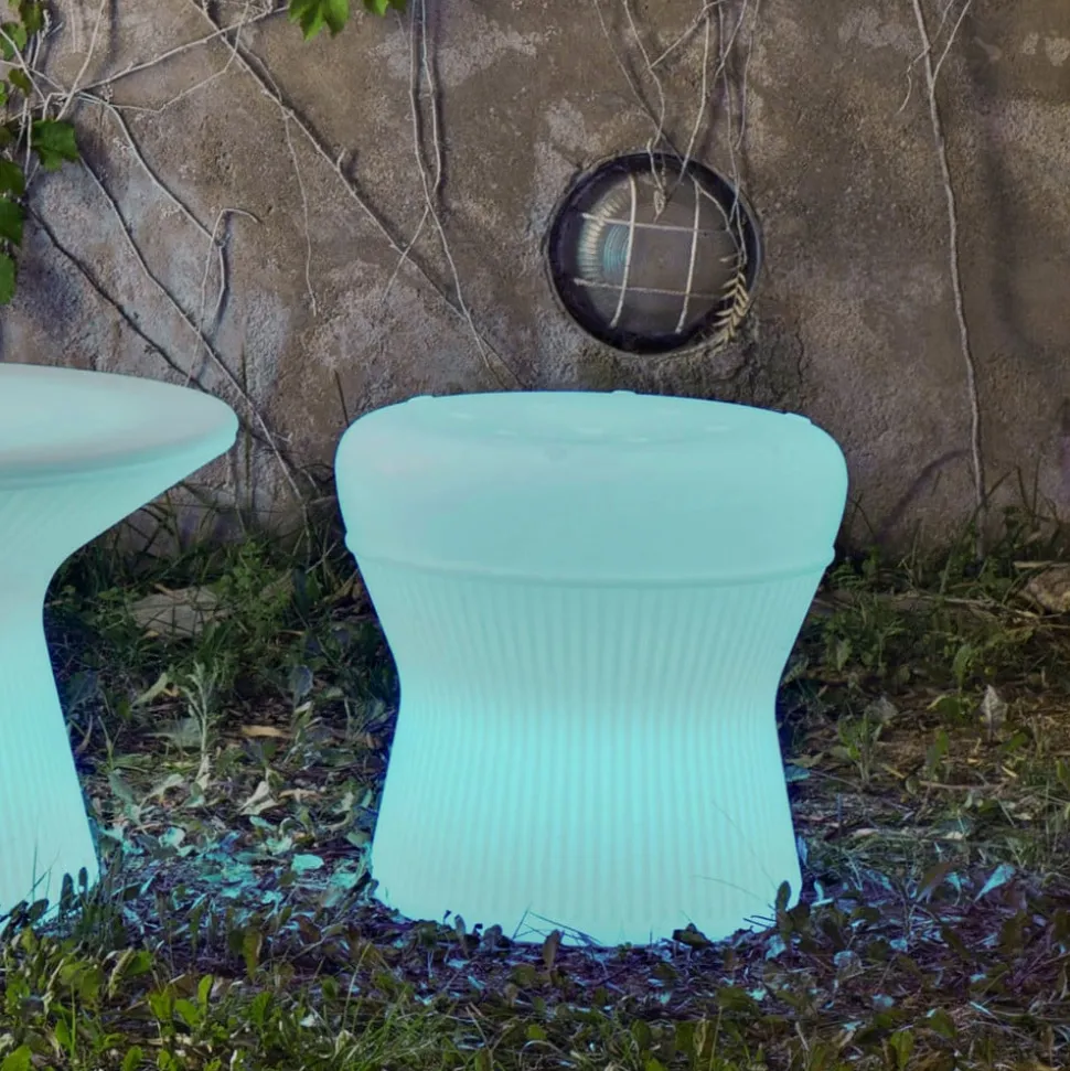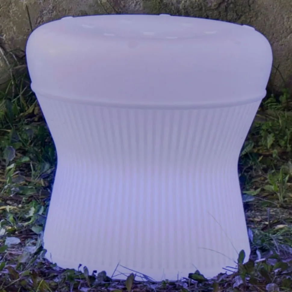 Oplyst skammel Corfu af polyethylen med solpanel og ladekabel Corfu er en rund, komfortabel skammel, der fanger øjet med sine integrerede LED’er i farvet eller hvid belysning. Skamlen er lavet af den gennemsigtige plast polyethylen, som næsten alle produkter fra det spanske mærke Newgarden er fremstillet af. Denne 100 % genanvendelige plast er særlig robust – den kan modstå ekstreme temperaturer og er UV-resistent. Der er indbygget et solpanel i skamlen, som oplader det integrerede batteri i sollys i løbet af dagen, så det fulde batteri holder i maksimalt 36 timer. Ud over fjernbetjeningen, som kan bruges til nemt at justere lysindstillingerne, leveres skamlen også med et ladekabel, så skammelens batteri også kan oplades ved en stikkontakt – Batteri 1 x 2.000 mAh lithium – Lysvarighed op til 36 timer afhængigt af lysindstillingen – Opladningstid 4 til 6 timer – Inkluderer 1,5 m ladekabel og IR-fjernbetjening