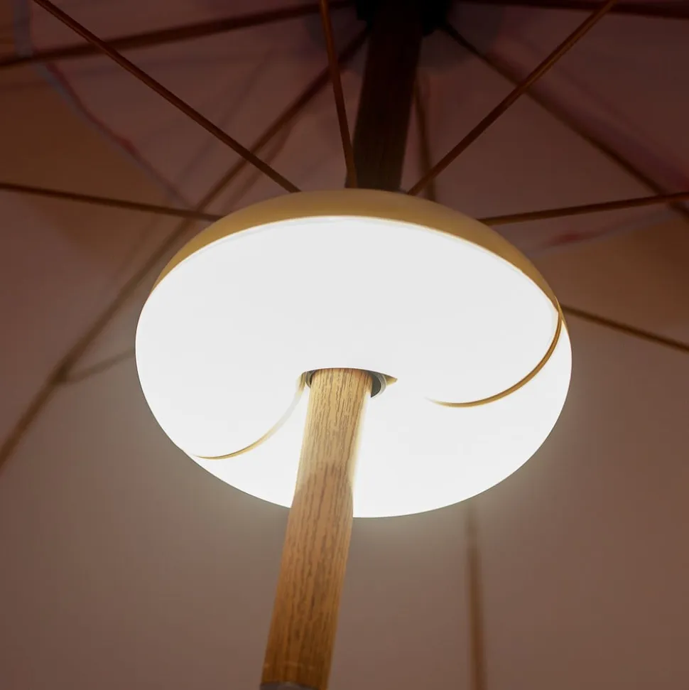 Batteridrevet belysning til lune sommeraftener under parasollen Når den varme sommerdag går på hæld, og det bliver mørkt, men du stadig gerne vil tilbringe tid på terrassen eller i haven, kan du bruge den batteridrevne Lima-lampe til at skabe belysning under parasollen. Det ringformede lys kan deles i to halvdele (magnetisk lås) og kan klipses fast om parasolhåndtaget. Lyset kan oplades ved hjælp af det medfølgende USB-C-kabel (netadapter medfølger ikke) og kan dæmpes i tre trin, tændes og slukkes og skifte til forskellige farver (RGBW) ved hjælp af fjernbetjeningen – maks. lysvarighed 20 timer