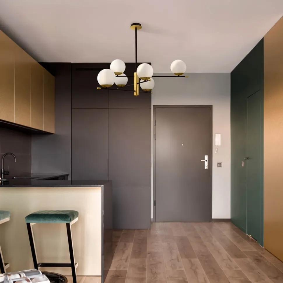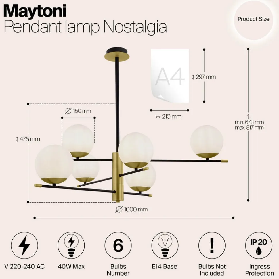 Lige linjer og sfærer – disse geometriske elementer bestemmer udseendet på den seks-flamme Nostalgi-pendel og giver, ligesom farverne mat guld, sort og hvid, en moderne elegance, der kan integreres i mange rum. Tre lige metalstænger er fastgjort til ophængningsstangen i midten. Dette skaber en lys rumbelysning fra en hængende lampe, der er en absolut iøjnefaldende, selv når den ikke er oplyst.
