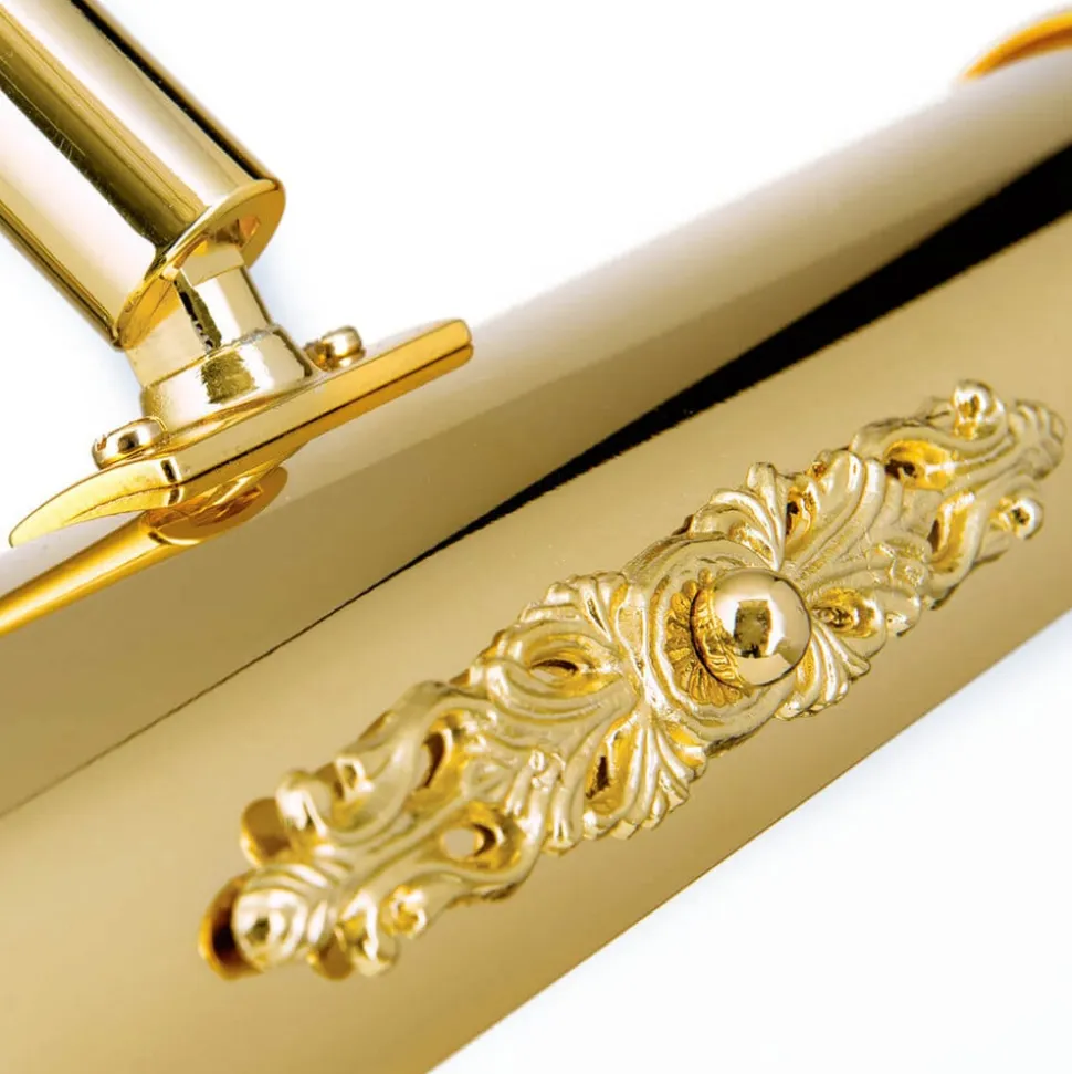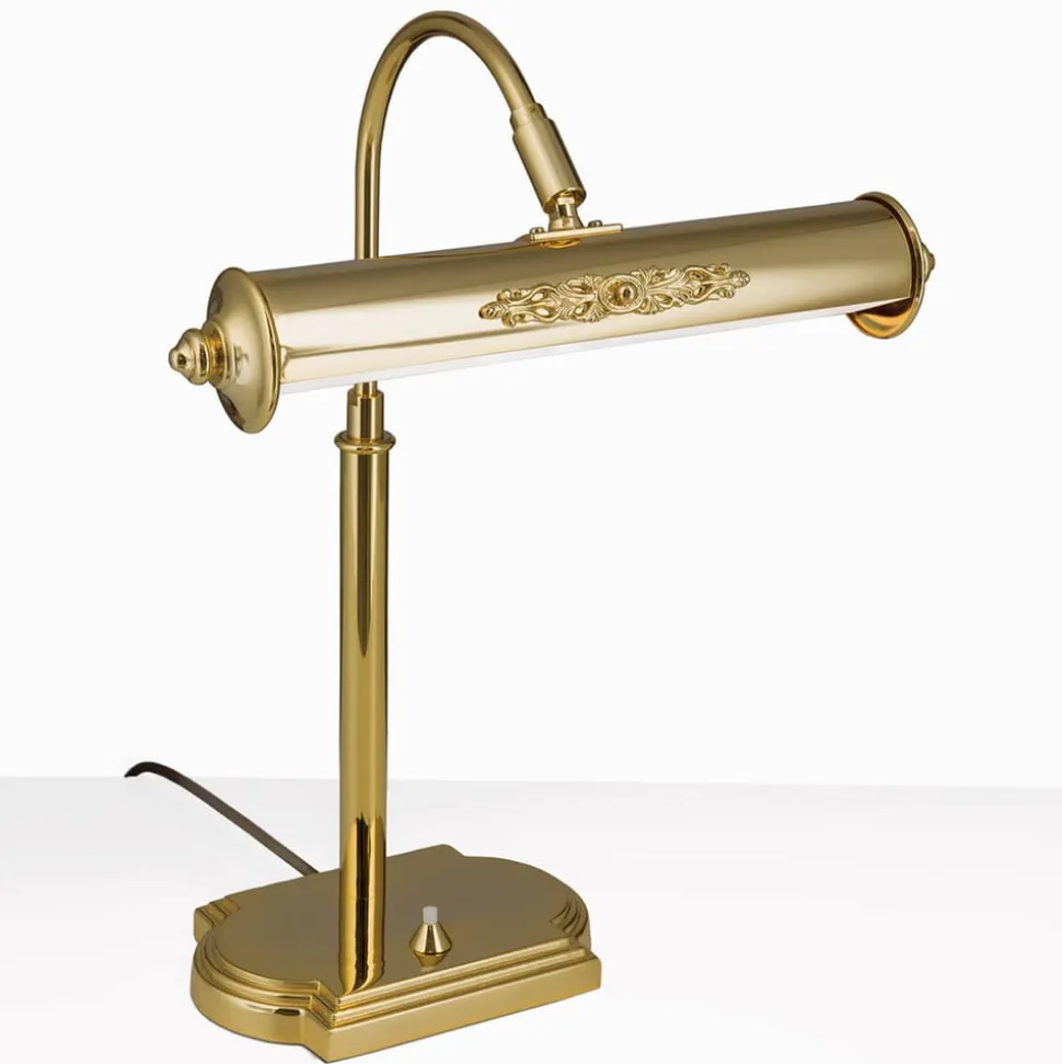 Den elegante skrivebordslampe Picture minder med dens nostalgiske elementer, om en billedlampe. Den smalle, rørformede skærm med nedadrettet lysudsendelse, er som selve stellet holdt i solid messing. Det dekorative element er også hold i en førsteklasses kvalitet, da det er fremstillet i støbt messing. Overfladen er belagt med 24 karat guld, og højglanspoleret. For en praktisk betjening finder man en trykkontakt direkte på lampefoden.