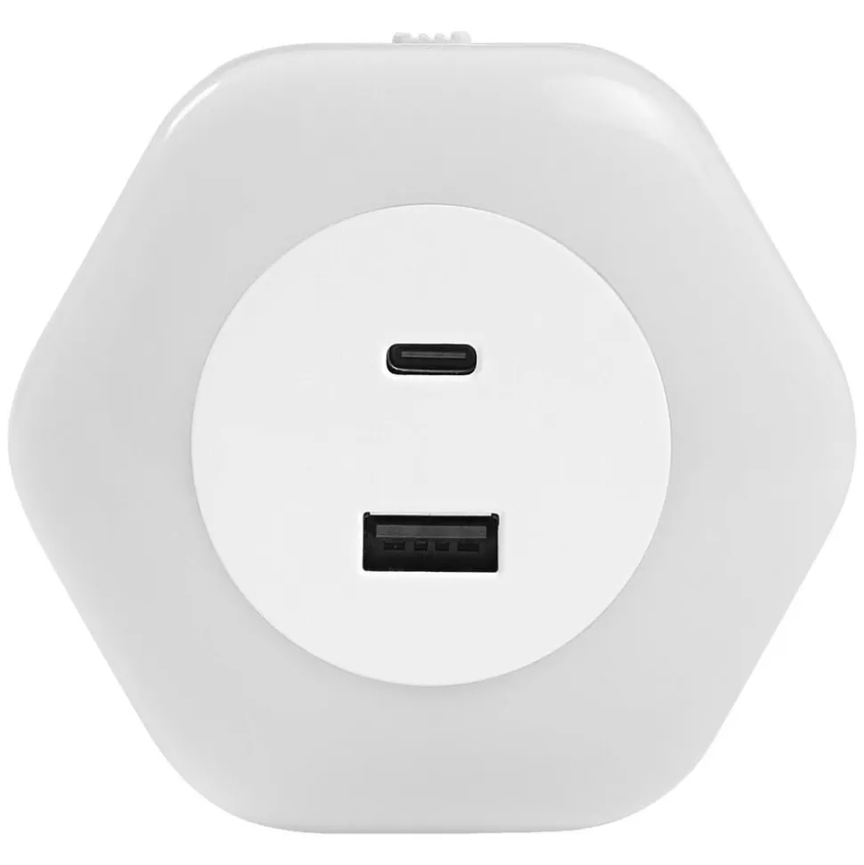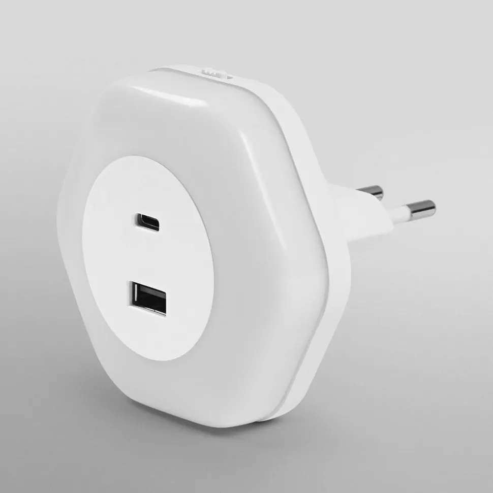 Praktisk LED-stikkontakt-natlampe LUNETTA HEXAGON med opladningsporte Forsyningsspænding: 30 V netspænding. Integreret dag-/natteføler. Produktfordele: Plug-and-play med EU-stik. Energieffektiv takket være LED-teknologi. Karakteristisk, elegant design. Anvendelsesområder: Soveværelse. Børneværelse. Gangarealer, trappeopgange. Natlampe. Kun til indendørs belysning.