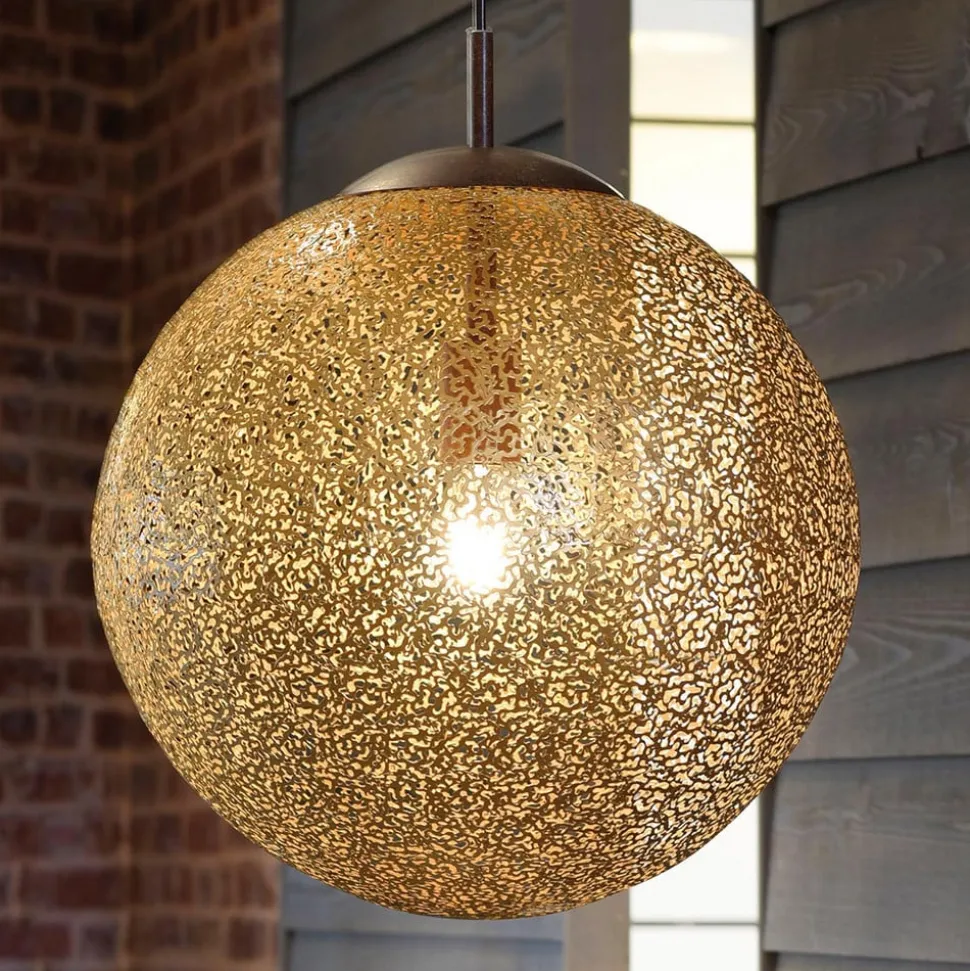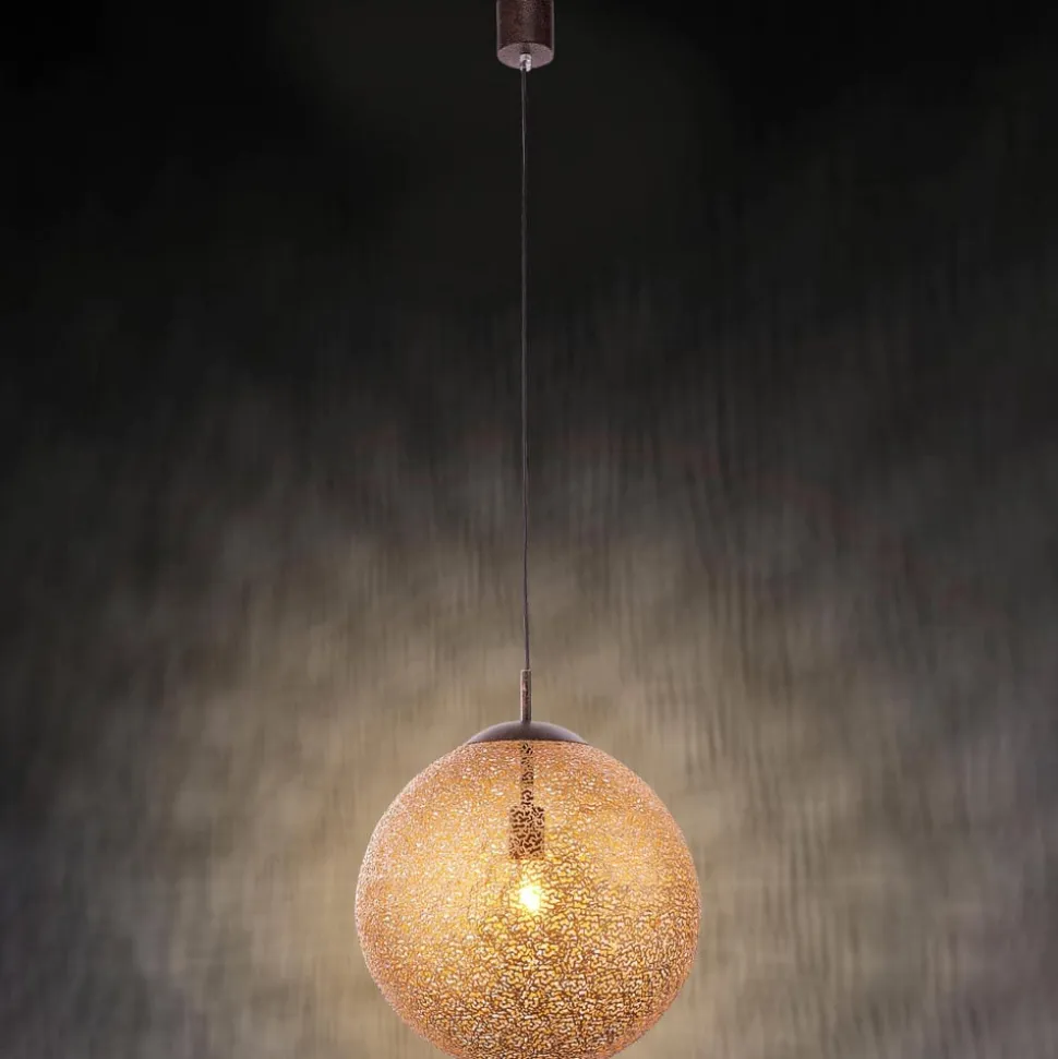 Greta – en hængelampe med en kugleformet skærm med et smukt mønster, 40 cm Kombinationen af baldakinens og skærmens rustbrunt lakerede metal og den guldfarvede kugleformede skærm med et smukt, gennemskinneligt mønster gør Greta hængelampen til en lyskilde, der ikke kun giver en hyggelig belysning, men også er et smukt dekorativt element over et bord. Flere lamper – eventuelt i forskellige størrelser – monteret som en gruppe ser også meget attraktive ud. Udstyret med alle typer pærer med E27-sokkel giver Greta-pendlen også energibesparende belysning.