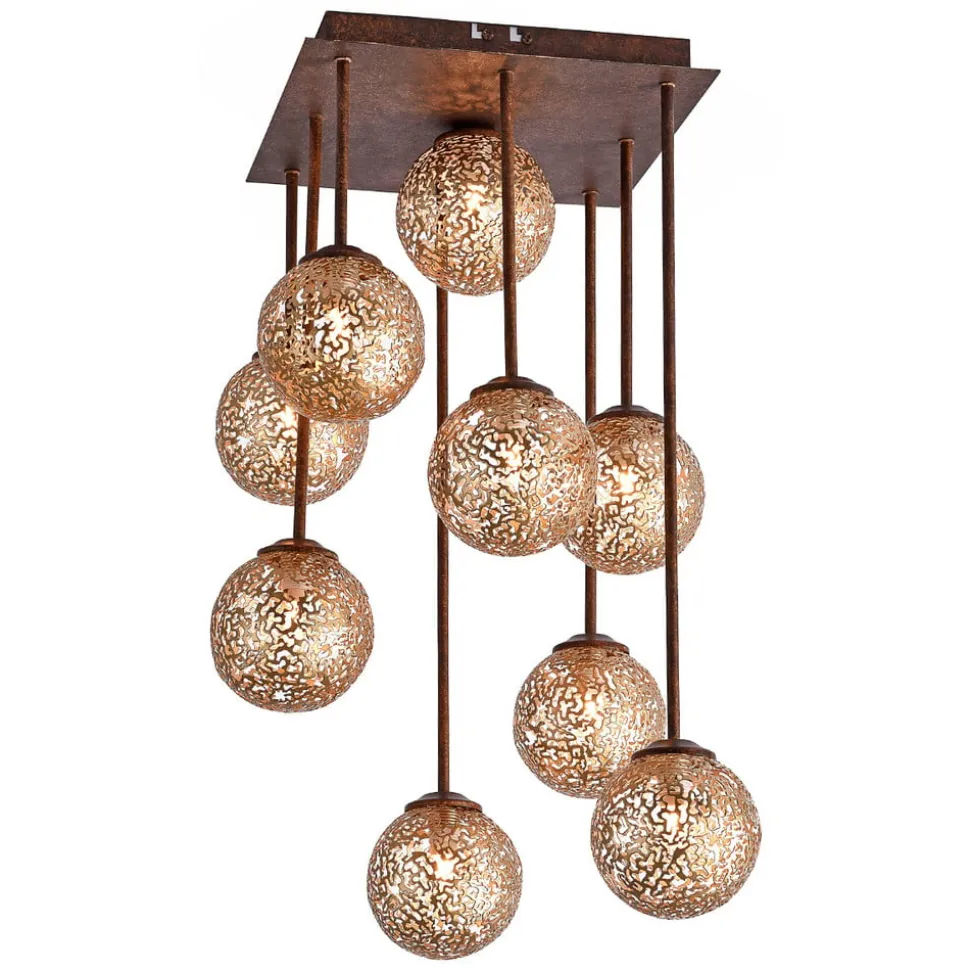 Greta – en loftlampe med 9 lyskilder, der fanger øjet Ni kugleformede skærme af stemplet metal med et smukt mønster og guldfarvet finish er jævnt fordelt og ophængt fra den firkantede baldakin på stive arme i forskellige højder. En skærm er monteret direkte i midten af den rustfarvede baldakin. Lampearmene er også rustfarvede, hvilket skaber en smuk kontrast til skærmene og fremhæver de kugleformede skærme. Loftlampens lyseffekt er også speciel, da skærmene kun er gennemskinnelige på grund af udskæringerne. Greta loftlampen kan også dæmmes med en ekstern lysdæmper (f.eks. drejedæmper på væggen) via husets installation. Dæmpere og pærer er ikke inkluderet i leveringsomfanget.