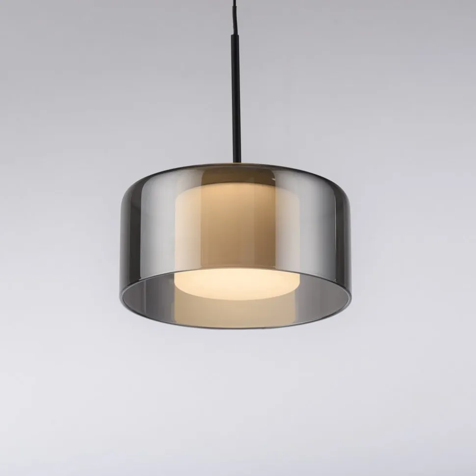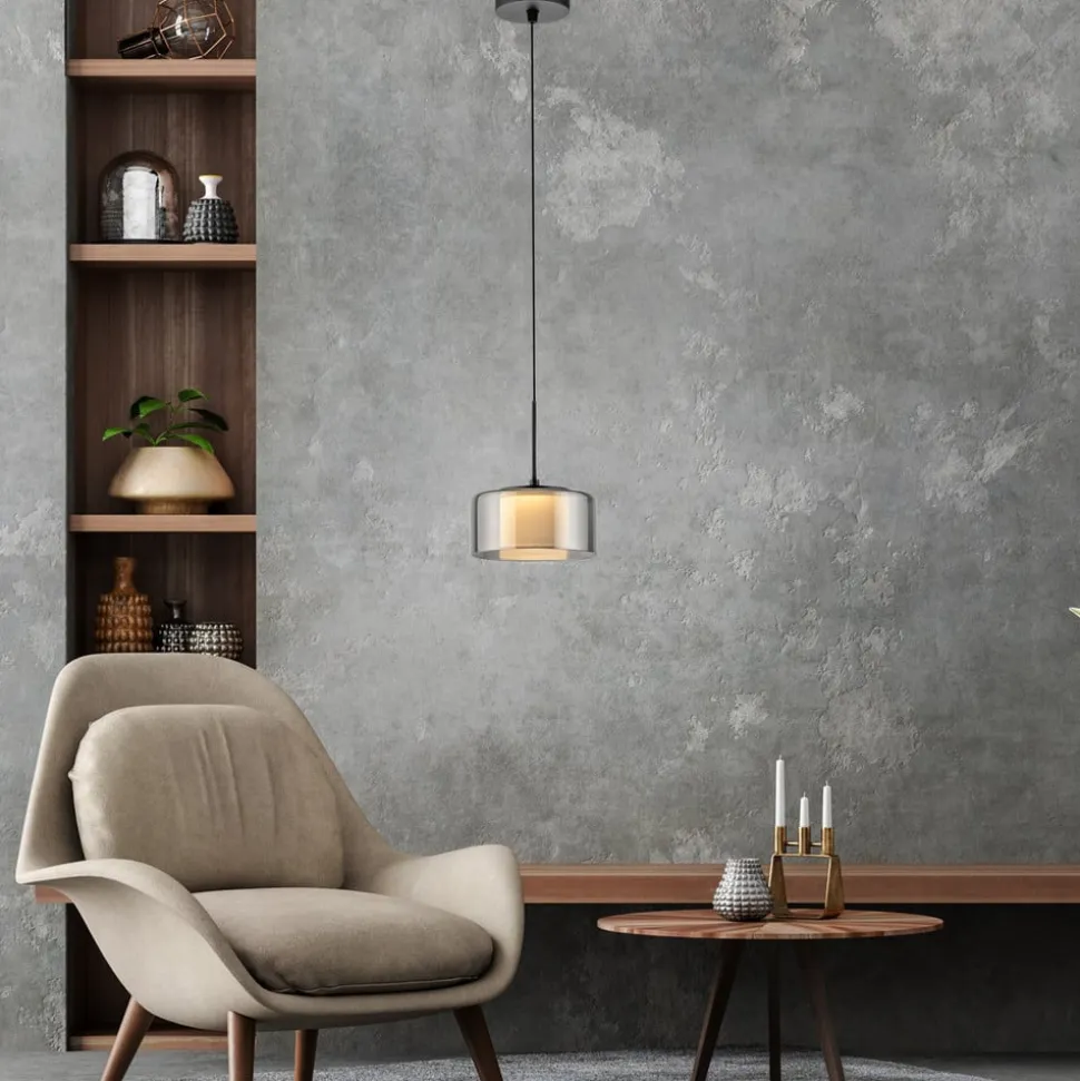 Moderne Rika LED-hængelampe af glas – dæmpbar via vægkontakt Den sorte Rika LED-hængelampe imponerer med sit moderne, enkle design. Takket være det røgfarvede glas og den varmhvide LED-pære udsender armaturet et blødt lys, der skaber en indbydende atmosfære over dit spisebord. Comfort-Lift-funktionen gør det nemt at justere højden. Takket være mekanismen, der er indbygget i baldakinen, er irriterende kontravægte ikke længere et problem. Højdejusteringssystemet gør det hurtigt og nemt for dig at justere højden på lampen, så den passer til din bolig. Lampen er udstyret med SimplyDim-teknologi. Denne funktion giver dig mulighed for nemt at dæmpe armaturets lysintensitet ved hjælp af den eksisterende lyskontakt. Lysdæmperteknologien styrer lysstyrken via koblingspulsen, så lyset kan dæmpes trinløst fra 100 % og ned til 10 % af lysintensiteten. Hvis lyset tændes igen mindre end 3 sekunder efter, at det er blevet slukket, starter dæmpningsprocessen. Når det har nået den lyseste (100 %) eller mørkeste værdi (10 %), forbliver det på denne indstilling i ca. 2 sekunder, før processen starter igen. Hvis lyset lyser med den ønskede lysstyrke under en proces, kan man spare på lysintensiteten ved at slukke for lyset. Hvis man tænder for lyset igen, lyser det med den gemte lysstyrke, og denne indstilling bevares. Det gør det muligt at justere lyset, så det passer til dine behov, og hurtigt finde det frem igen. Placer pendellampen over spisebordet, og indhyll rummet i en hyggelig atmosfære.