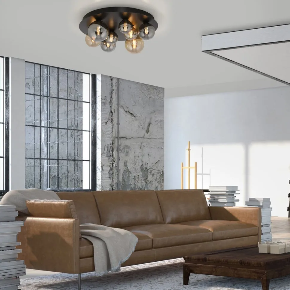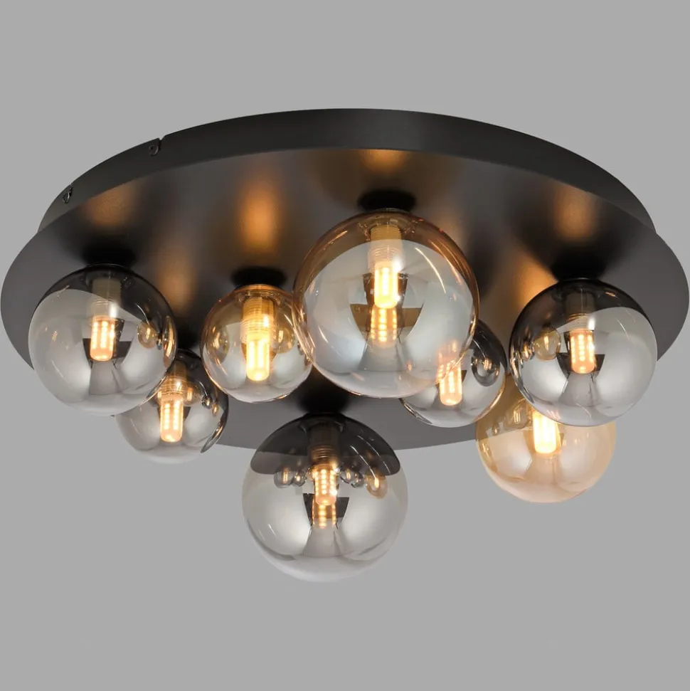 Loftslampe Popsicle leveres med en sort loftsplade af jern samt elegante glaskugler i ravfarvet og røggrå. Dermed sætter lampen ikke kun stilfulde accenter, men passer også perfekt ind i forskellige rumkoncepter. Med sin varmhvide lysfarve skaber den en behagelig atmosfære, der både passer godt i stuen, soveværelset og entreen.