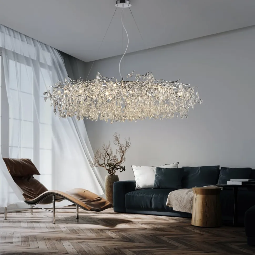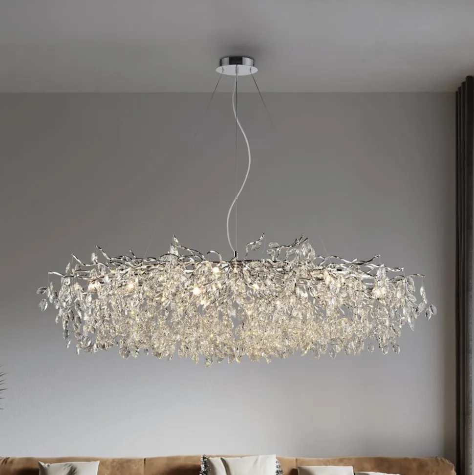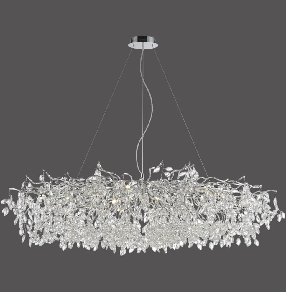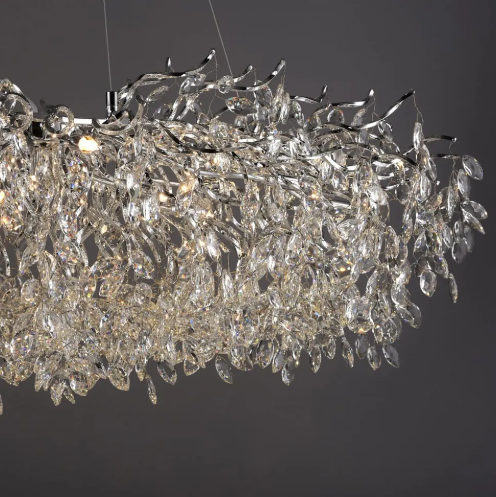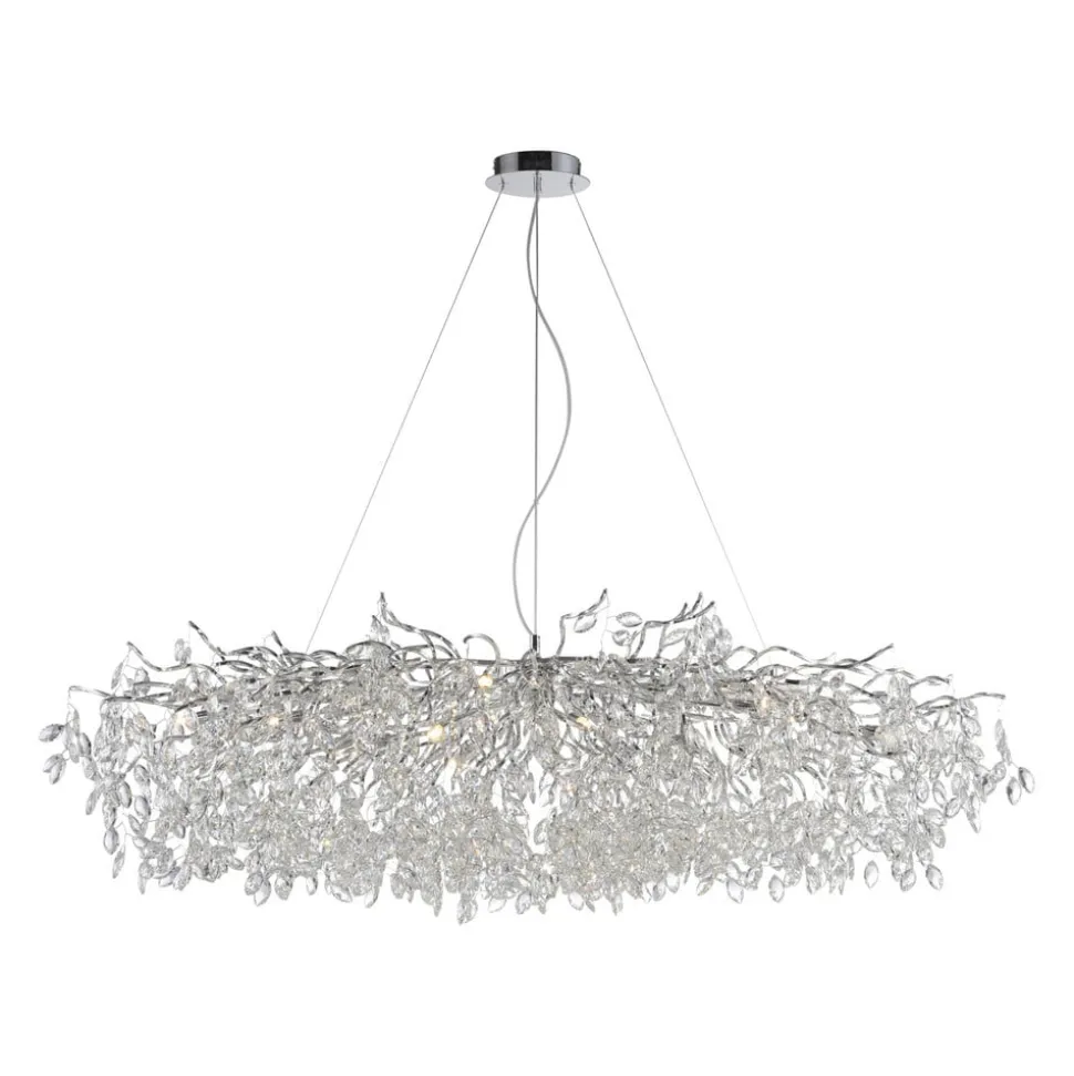 Ricicle-lysekrone af forkromet metal med krystalvedhæng Ricicle-lysekronen ser luksuriøs og elegant ud i ethvert rum, uanset om det er stuen, entréen, hotellobbyen eller hallen. Den elegante lysekrone af skinnende forkromet metal er udstyret med utallige strenge af funklende krystalvedhæng og giver et betagende lysspil, der vil fortrylle ethvert rum. Dens pompøse tilstedeværelse og eksklusive udstråling gør lysekronen til et elegant blikfang i ethvert rum. Lysekronen er udstyret med G9-fatninger, som kan bruges med både LED-lamper og halogenlamper for at være opdateret med hensyn til energieffektivitet. Pendlerne i glaskrystal reflekterer lyset på en fascinerende måde og skaber en indbydende og blændende atmosfære.