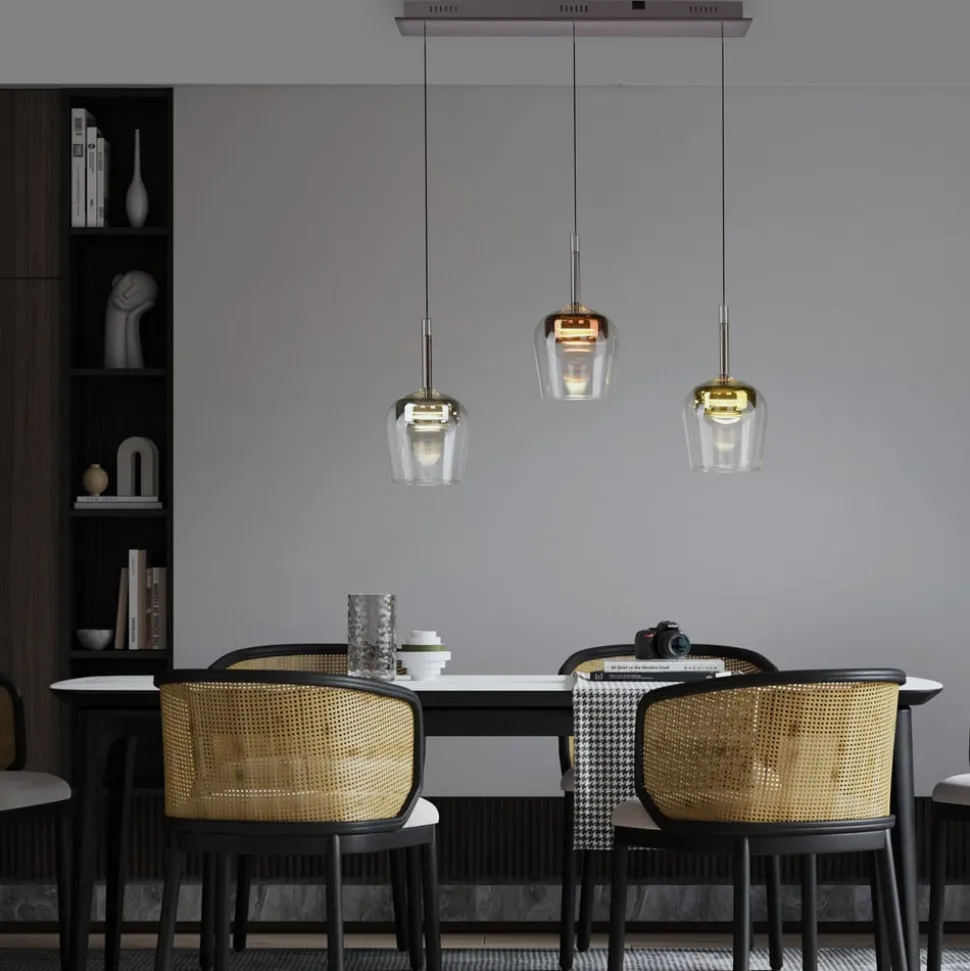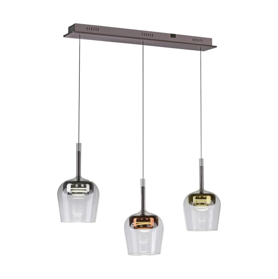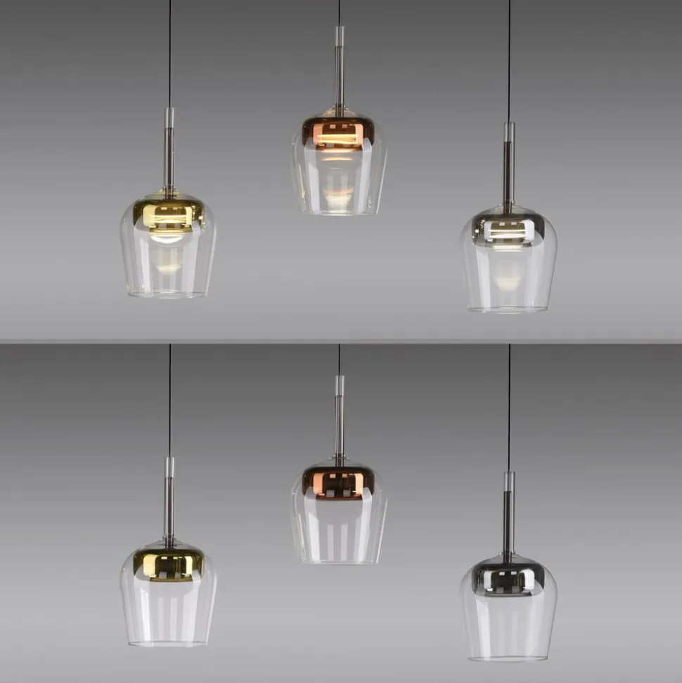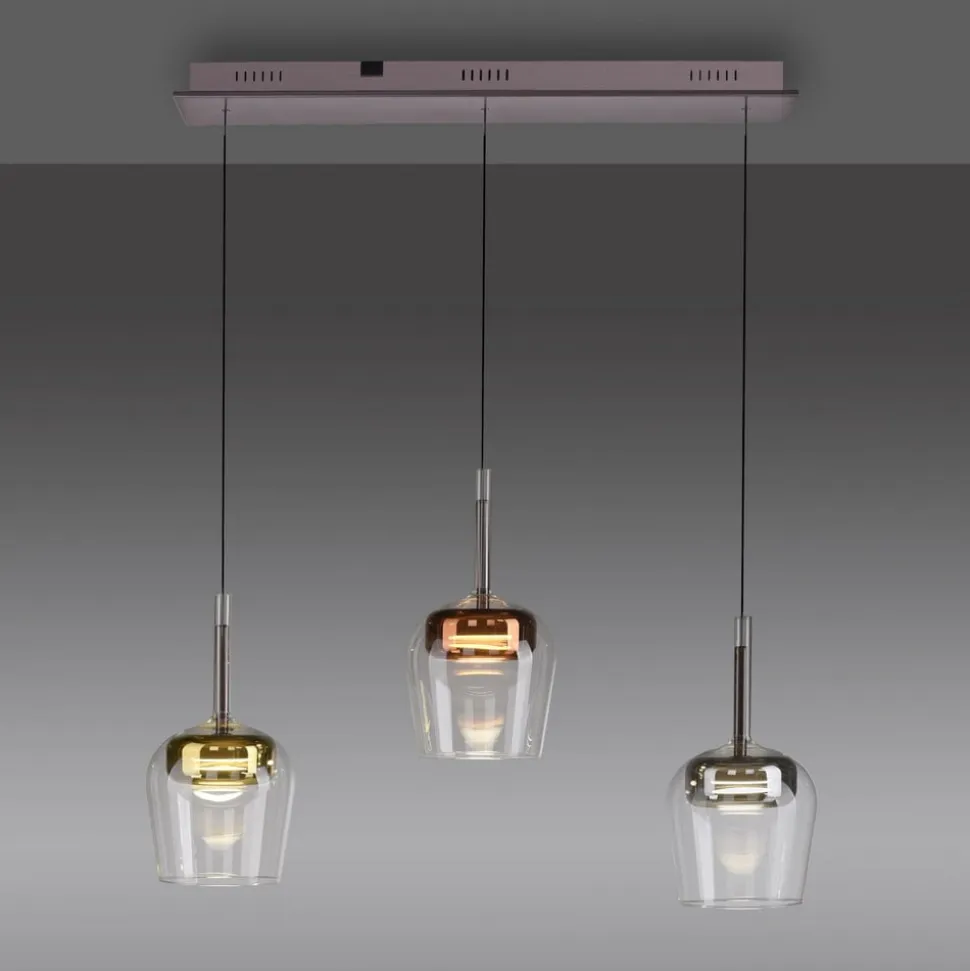 Q-Kon udendørs hængelampe med lampeskærme i glas og metaldetaljer – smart og kan styres med fjernbetjening Q-Kon hængelampen er både en æstetisk og funktionel tilføjelse til moderne stuer og opholdsrum. De tre lampeskærme, der hænger på række, er hver især udstyret med buet, gennemsigtigt glas, der smalner af i bunden. Hver skærm indeholder en aluminiumskrop med en finish i guld, bronze eller sølv. De nedadrettede LED-moduler giver direkte bord- eller områdebelysning. Takket være Comfort Lift kan højden på pendlen til enhver tid justeres manuelt, og en passende fjernbetjening til at tænde, dæmpe og justere farvetemperaturen er allerede inkluderet i leveringsomfanget. Ud over fri justering af lyset giver det også forudkonfigurerede muligheder, så den perfekte belysning er praktisk tilgængelig i næsten enhver situation. Alternativt kan Q-Smart-Home pendellampen integreres trådløst i ZigBee-baserede smart home-systemer (bro kræves) for at styre den via app eller stemmekommando, afhængigt af konfigurationen.