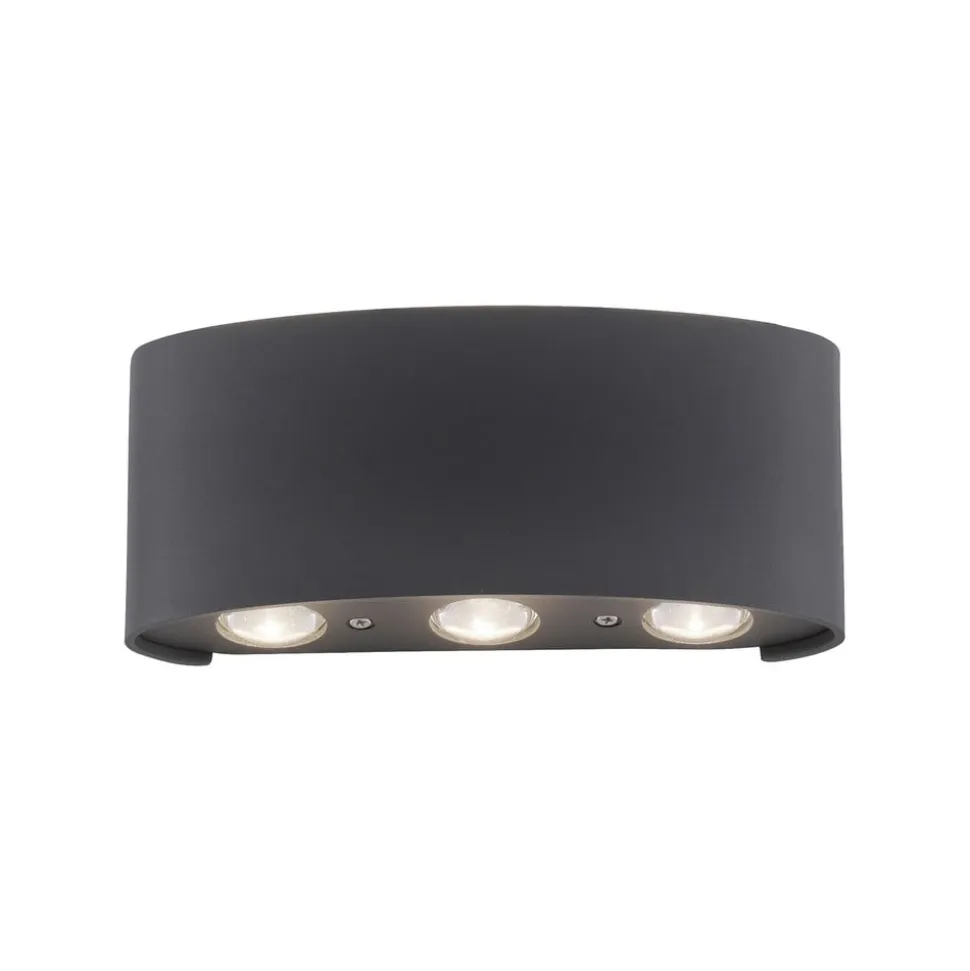 Den antracitfarvede LED-væglampe Carlo overbeviser med sit moderne og enkle design. De tre pærer, der monteret øverst og nederst på den halvrunde lampe, giver fantastiske lyskoner, der overlapper hinanden på dekorativ vis og dermed skaber et smukt, dekorativt lys. I alt er der seks fastmonterede, varmhvide LED’er. Takket være LED-teknikken er lampen energibesparende og overbeviser med lav varmeudvikling og lang levetid. Væglampe er velegnet til både indendørs og udendørs brug takket være kapslingsgrad IP54. Sæt et imponerende præg med den moderne LED-væglampe rundt om dit hus. Den ideelle lampe til indendørs og udendørs brug. Sæt et særligt blikfang på dine husvægge med lampen, uanset om det er i gangene eller i entréen.