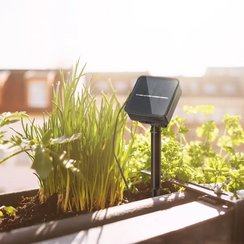 Solar LED-strip 78897 med skumringssensor, solpanel og genopladeligt batteri Den tre meter lange LED-strip skaber en hyggelig atmosfære på altanen eller terrassen eller endda i haven, langt væk fra en strømtilslutning, da den drives af solen. Det eksterne solpanel kan ganske enkelt sættes i jorden eller i en krukke og rettes perfekt ind efter solen. Båndet kan afkortes på de markerede punkter. Den er udstyret med varmhvide LED’er, og bagsiden er selvklæbende, så den er nem at montere. Lyset tændes automatisk i skumringen af skumringssensoren. Afhængigt af mængden af sollys er opladningstiden 4 til 6 timer; når den er fuldt opladet, lyser strimlen i 3 timer.