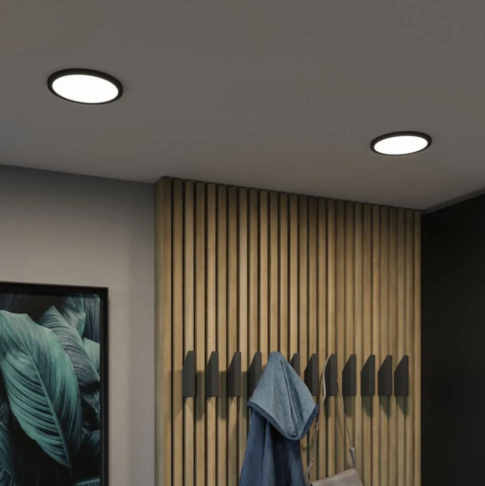 Dæmpbart LED-panel Areo VariFit i rund form, sort Det runde LED-indbygningspanel Areo VariFit med sort ramme og IP44-beskyttelsesgrad kan installeres i badeværelser og fugtige rum samt i en lang række andre områder. Lysstyrken kan skiftes i tre trin via den konventionelle lyskontakt (3-trins dæmpning) uden yderligere installationsarbejde. Panelet er udstyret med justerbare klemfjedre, så det kan installeres i installationsåbninger af forskellige størrelser – Justerbare klemfjedre – Ensartet og bred belysning – Tre lysstyrkeniveauer kan vælges via lyskontakten