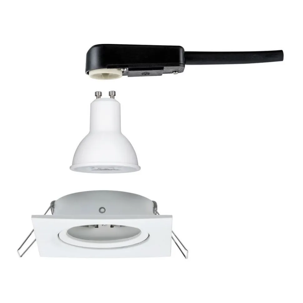 Nova kantet LED-indbygningsspot med IP23-beskyttelse Nova er et kantet LED-spot, som er beskyttet mod vandsprøjt takket være IP23-beskyttelsen. Spottet kan nemt fastgøres i loftet ved hjælp af holdefjedrene og kan også kombineres med andre spots for at skabe et skræddersyet belysningssystem ved blot at koble dem sammen. Nova er udstyret med en LED-lyskilde (GU10) med varmt hvidt lys, hvor lyskilden kan udskiftes. Lyskilden kan drejes 50° og dæmpes i 3 trin med en almindelig lyskontakt.