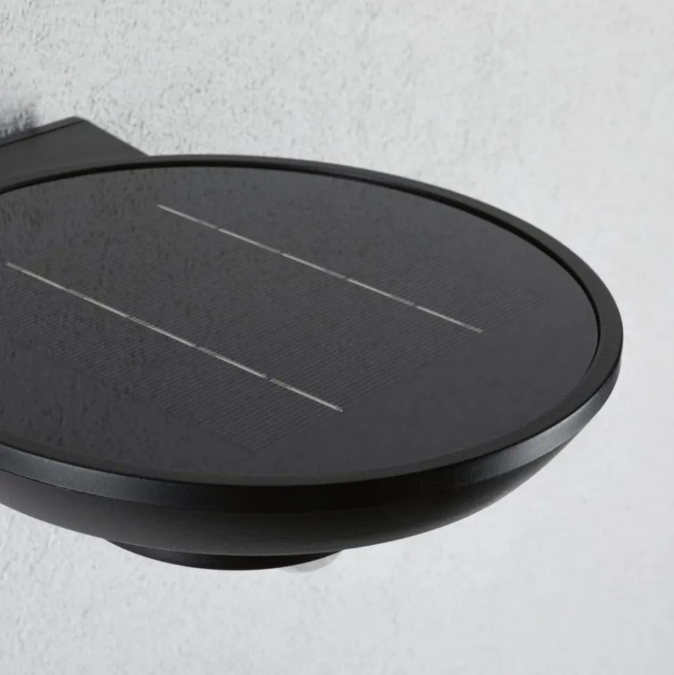 Bordola udendørs LED-væglampe med sensorstyring, genopladeligt batteri og solcellemodul Som selvstændig lyskilde er Bordola LED-væglampen et særligt praktisk valg til udendørs områder. Det sorte plasthus rummer en nedadvendt, U-formet lysudstråling, hvorigennem det varmhvide lys spredes og udsendes bredt. Den tændes automatisk af en skumrings- og bevægelsessensor. Derudover kræves der ingen ekstern strømtilslutning, da Bordola udendørs LED-væglampen er udstyret med et genopladeligt batteri og solcellemodul – Kapslingsgrad: IP44 – Udstyret med solcellemodul og genopladeligt batteri (Li-Ion, udskifteligt) – Sensor: infrarød, rækkevidde maks. 5 m, registreringsvinkel maks. 110°