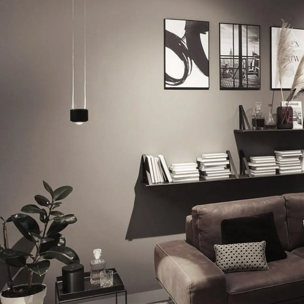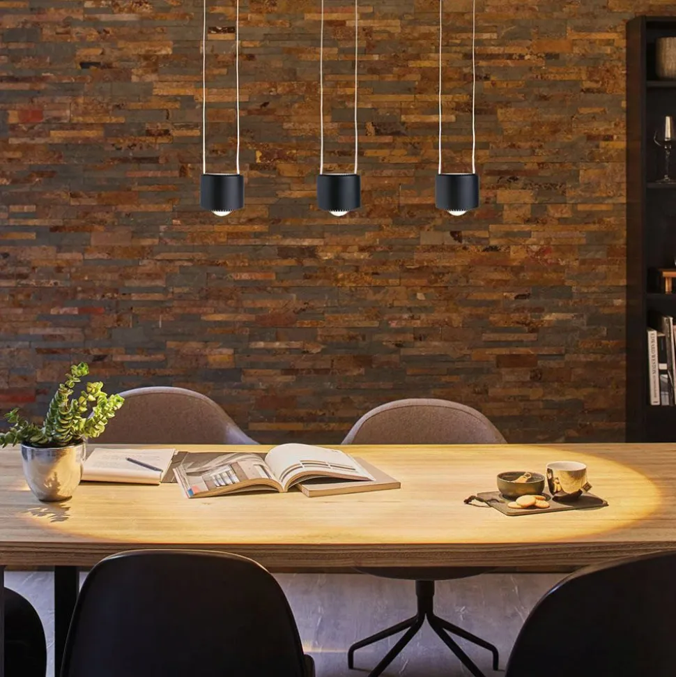 Elegant Aldan LED-pendel som supplement til URail-skinnesystemet Aldan LED-pendlen er designet som en moderne komponent til URail-skinnesystemet og kan kun bruges sammen med det. Den har et rundt, iøjnefaldende armaturhus, hvorfra en linse stikker ud i bunden. De varmhvide LED’er er installeret bag denne linse og udsender direkte lys nedad. Til accentbelysning sendes lyset også indirekte opad og oplyser forsigtigt omgivelserne. Pendlens højde kan justeres fra 150 cm til et minimum på 20 cm efter behov. Armaturet kan også dæmpes med forskellige konventionelle lysdæmpere (med lysdæmper R, L, C).