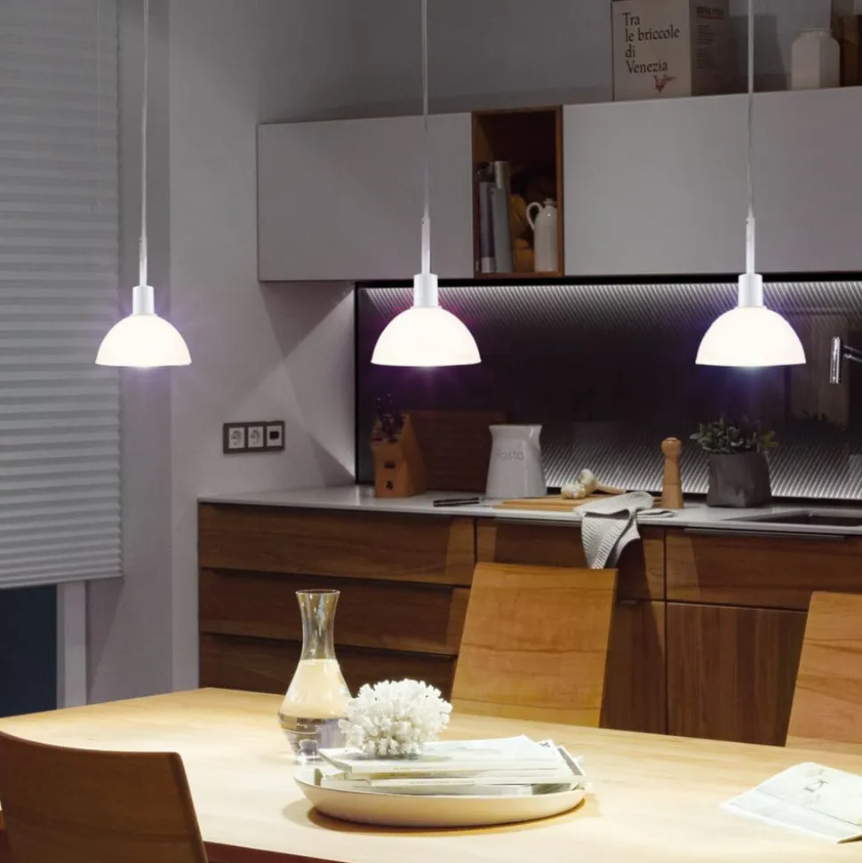 Sarrasani pendel med opalhvid skærm til URail skinnesystem Sarrasani er en pendel med en halvcirkelformet, opalhvid glasskærm, der kan integreres i URail skinnesystem til belysning af borde eller diske. Pendlen skaber et visuelt højdepunkt i skinnesystemet. Pendlen kan afkortes individuelt og udstyres med en lyskilde efter eget valg med E14-fatning, så den kan tilpasses optimalt til de respektive krav og rumlige forhold.