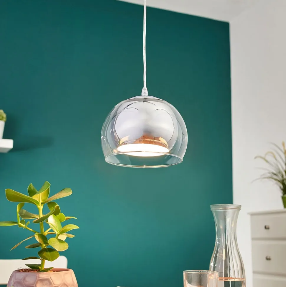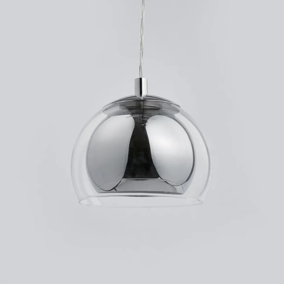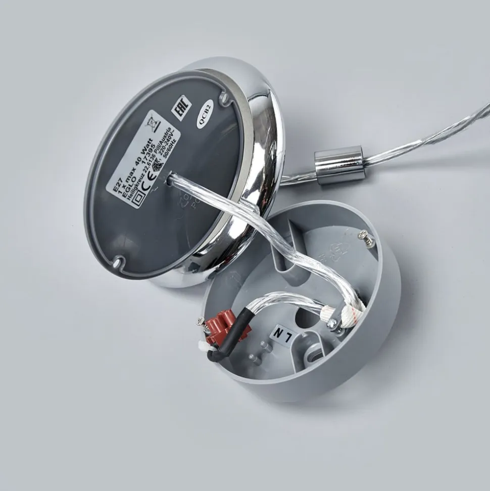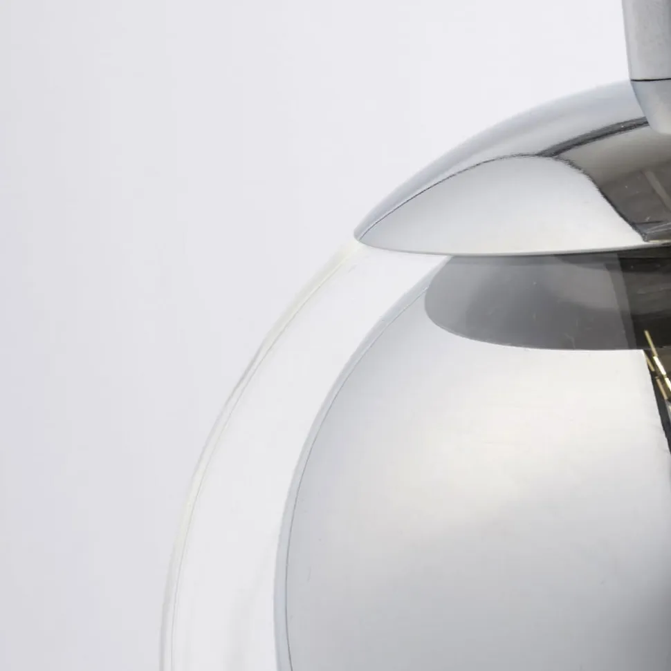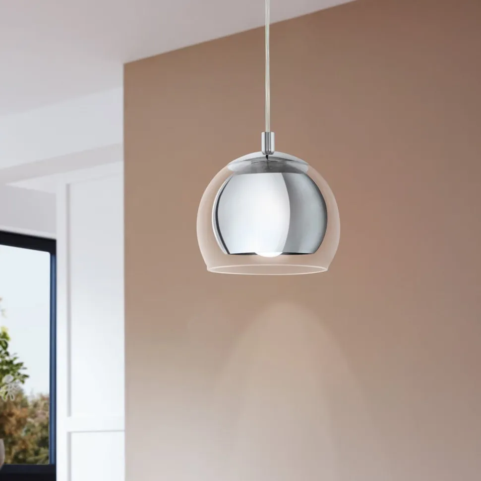 Elegant designet Rocamar-pendel Rocamar-pendlen med en enkelt lampe imponerer med sit ekstremt elegante design, som opnås ved skærmdesignet i to lag. Den ydre skærm er lavet af transparent glas, mens den indre skærm er lavet af forkromet metal. Den blanke kromfinish på den indre skærm giver armaturet et elegant udseende, som suppleres vidunderligt af det gennemsigtige glas. Lyset skinner nedad fra den indvendige skærm og fremhæver, sammen med glasskærmen, overfladen nedenunder på perfekt vis.