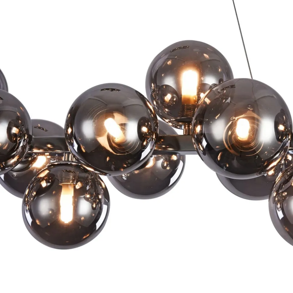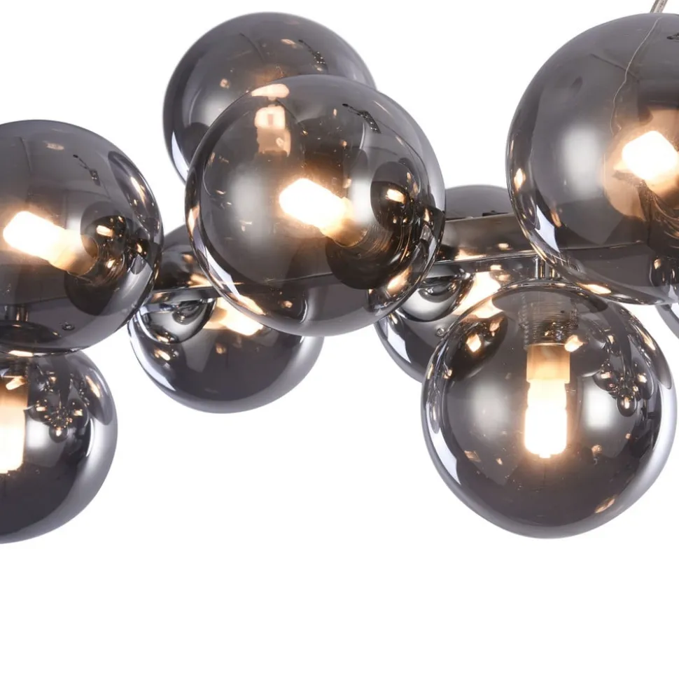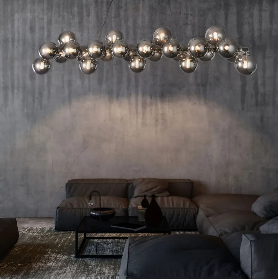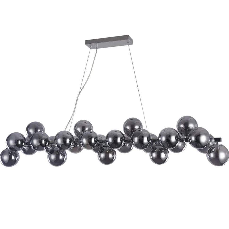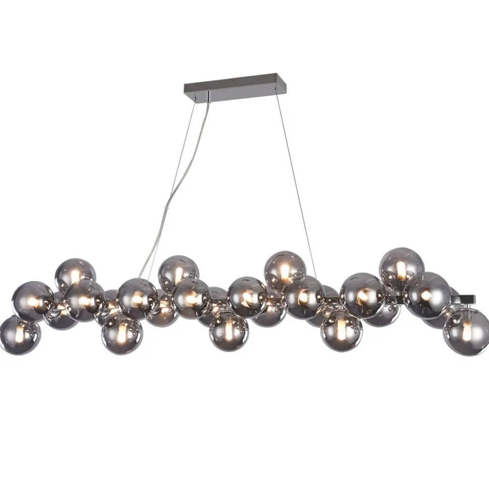 Dallas pendel med kromfarvede kugler Dallas pendel med 25 lys er en drøm: Den aflange skærm består af kromfarvede kugler, som er fastgjort til en lang metalstang. Det komplette armatur ser moderne og samtidig meget festligt ud, da de oplyste glas udstråler et særligt strålende lys på grund af deres farvetone. En iøjnefaldende grund- og områdebelysning til det moderne boligområde, som giver hvert rum en særlig eksklusivitet.