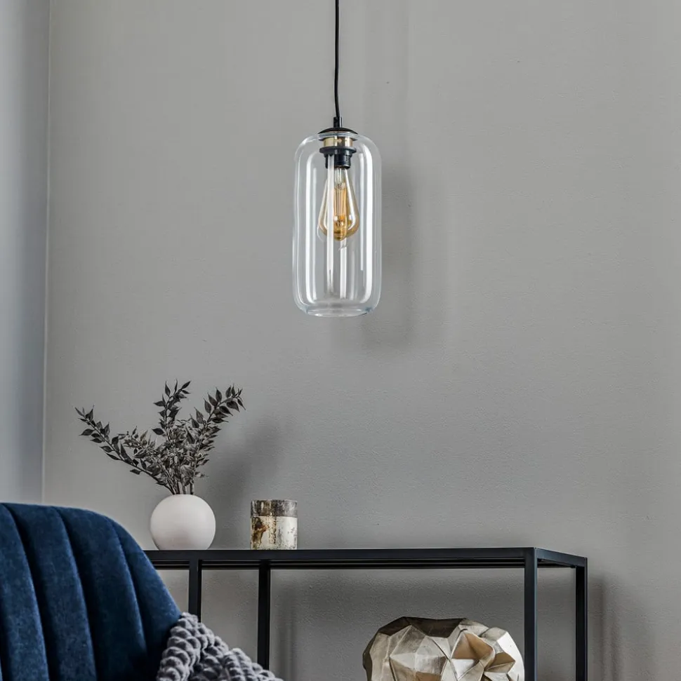Et særligt kendetegn ved denne lampe er, at den kan dæmpes via en ekstern dæmper. Dette gør det muligt at justere lysintensiteten fleksibelt for at skabe den ønskede stemning, hvad enten det er til afslappede aftener eller produktive øjeblikke. Kombinationen af transparent glas og sort design giver pendellampen en moderne æstetik, der er både funktionel og dekorativ.