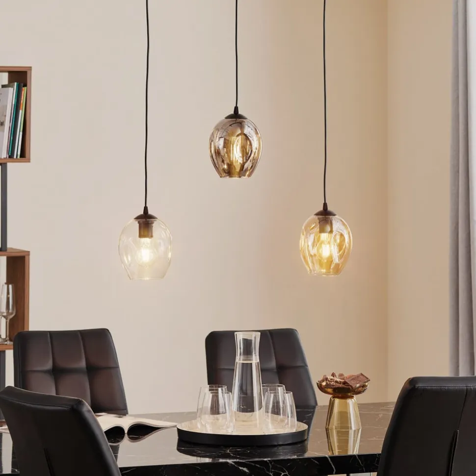 Pendellampe Starla lige 3 lyskilder grafit/amber/klar forener moderne design med materialer af høj kvalitet. Fremstillet af pulverlakeret stål og glas, er den et stilfuldt supplement til stuen, spisestuen eller køkkenet. Kombinationen af grafit, amber og klare farver giver ethvert rum en særlig atmosfære og sætter elegante accenter.