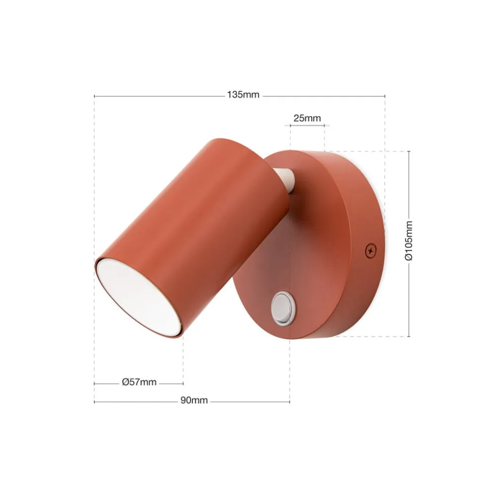 - Højde på vægbeslag 2,5 cm; lampehoved – længde 9 cm, Ø 5,7 cm