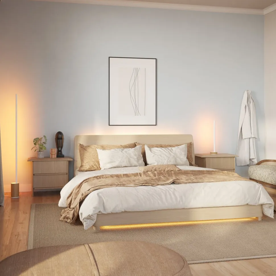 Minimalistisk Signe Oak LED-gulvlampe skaber stemningsfulde farvegradienter Signe Oak LED-gulvlampe fra Gradient-produktserien fra Philips Hue imponerer med sin minimalisme, som opvejes af de næsten ubegrænsede muligheder for lysstyring. Det slanke design kombineret med den naturligt udseende, cylindriske base af egetræ skaber en bevidst accent i rummet, selv når den er slukket. Udstyret med Gradient-teknologi kan der skabes betagende lyseffekter, da alle Gradient-produkter kan skabe statiske og dynamiske farvegradienter. Gulvlampens højde kan bruges til at generere flere farver samtidig, som kan justeres via appen for at skabe individuelle farvegradienter. Ud over forudkonfigurerede scener kan du også oprette og anvende dine egne, så der er ingen grænser for valg og kombination af farver.