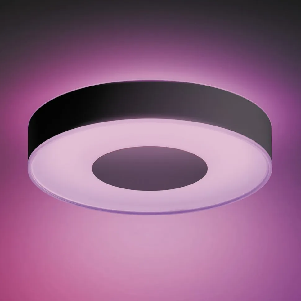 Smartstyrbar Philips Hue LED-loftslampe Infuse, White og Colour Ambiance Den moderne og elegante Infuse LED-loftslampe giver direkte lys og loftsbelysning for omfattende rumbelysning. Den har et rundt design med en ramme, der løber rundt om siderne, og et centralt dæksel på undersiden. Ud over hvidt lys i forskellige farvetemperaturer, som varm hvid eller dagslys, tilbyder armaturet også farvet lys, hvilket muliggør en lang række belysningsscenarier; lysstyrken kan også justeres til enhver tid. Lyset styres enten direkte via Bluetooth ved hjælp af en smartphone/tablet eller integreres i et smart home-system, såsom Philips Hue, via en ZigBee-bro. Særlige egenskaber/kompatibilitet – dæmpbar (via app, lysdæmperkontakt (medfølger ikke) eller stemmekommando) – justerbar lysfarve (varm hvid til dagslys, 16 mio. farvenuancer) – kompatibel med eksisterende lysnet. farvenuancer) – kompatibel med eksisterende Philips Hue-system – kan styres med passende Hue-app (i kombination med Hue Bridge) og Hue Bluetooth-app (direkte med smartphone/tablet) – kompatibel med andre ZigBee-baserede systemer, såsom Innogy, Bosch, Magenta (Telekom) og Busch-Jäger – mulighed for intelligent lysstyring a: ZigBee-integration via bro og router, såsom Philips Hue Bridge (se tilbehør); dette muliggør lokal- eller fjernstyring via Hue-appen og mulighed for stemmestyring via Amazon Alexa, Apple HomeKit (Siri) og Google Assistant.