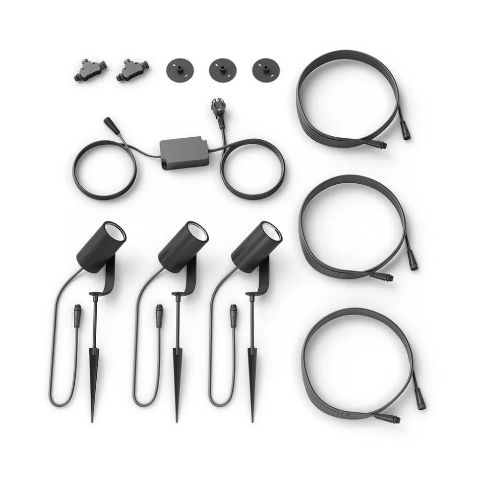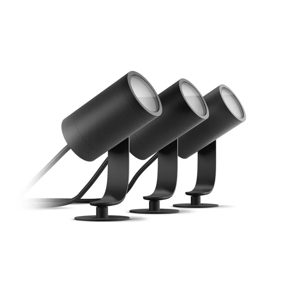 Philips Hue Outdoor Bundle Lily med tre LED-spots og matchende Hue Bridge for direkte adgang til intelligent udendørsbelysning De tre Lily LED-spots kan installeres fleksibelt udendørs takket være det store udvalg af tilbehør. Du kan vælge mellem jordspyd eller vægbeslag, hvilket gør det muligt at montere dem til forskellige formål. Spotsene er nemme at forbinde med hinanden og kan integreres i dit eget Philips Hue smart home-system takket være den indbyggede ZigBee-teknologi. Det gør det muligt at styre lyset direkte via Hue-appen med en smartphone eller tablet. En praktisk funktion ved denne pakke er, at den nødvendige Hue Bridge er inkluderet i sættet, så du kan komme i gang med det samme. Ud over at spottene kan drejes efter ønske, er de især imponerende takket være de funktioner, de tilbyder, når de er integreret i Hue Bridge. Lily kan lyse i et udvalg af 16 millioner klare farver og har adgang til 50.000 forskellige nuancer af hvid. Det skaber unikke lysstemninger i udendørsarealer med en umiskendelig atmosfære. Dæmpbarheden og styringen via lysscener eller tidsplaner understreger også den alsidige brug af dette bundt og muliggør individuel belysning.