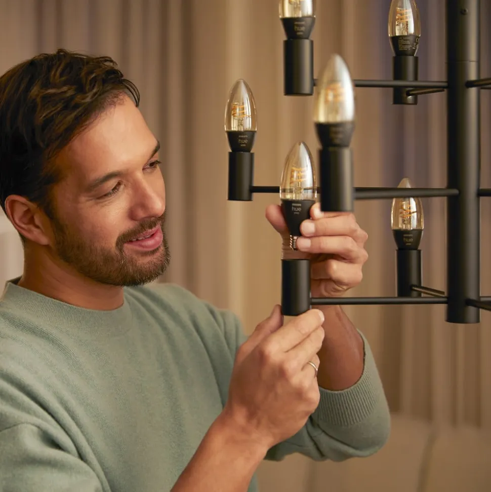 sæt med 2 Philips Hue White Ambiance LED-glødelamper, E14 4,6W 350lm Denne dekorative Philips Hue E14 LED-glødelampe med klart glas i stearinlysform imponerer med sin moderne styrbarhed og alsidige lys. Den kan betjenes enten med app eller stemmekommando. Farvetemperaturen kan justeres fra varm hvid til dagslys, og LED-lyskilden kan også dæmpes – praktisk 2-pak – kan styres via Bluetooth ved hjælp af den matchende Hue-app – kan styres med kompatible stemmeassistenter som Amazon Alexa – kan integreres i et eksisterende Hue smart home-system, Hue Bridge kræves (se tilbehør) – kan dæmpes via app eller matchende Philips Hue-dæmperkontakt (se tilbehør)