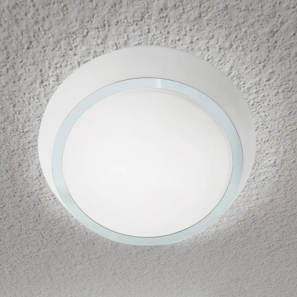 Pia loftslampe med IP44 til badeværelsetPia loftslampen er meget enkel og klassisk i sin form, men den skiller sig ud med den forkromede dekorative ring. På en ædel og elegant måde giver armaturet et behageligt rumlys. Takket være IP44 er den også godt rustet til fugtige forhold i badeværelset.