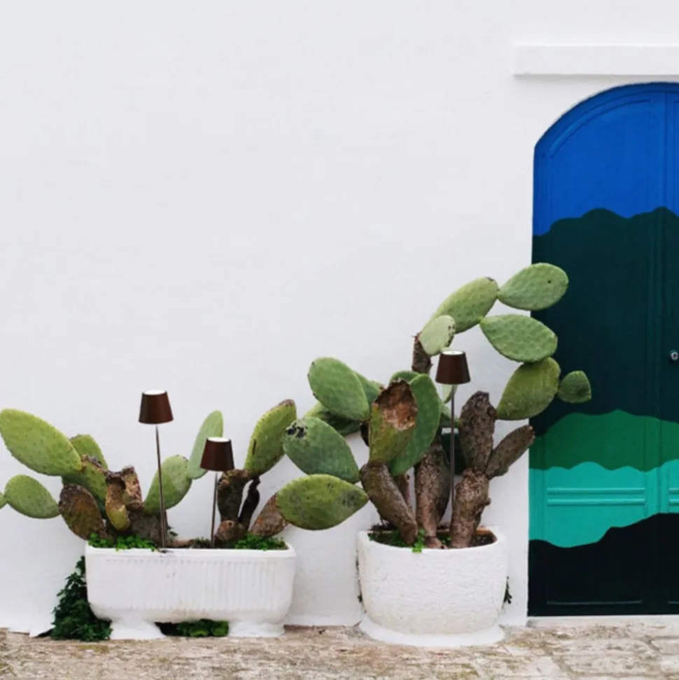Poldina sætter lysakcenter, hvor der er brug for det, for takket være batteridrift giver den ca. 9 timers lys og kan takket være IP54-beskyttelse både indendørs og udendørs anbringes i blomsterpotter eller direkte i jorden. Opladning sker via USB-porten på undersiden af skærmen. LED’erne tændes og slukkes via touch-dæmpningskontakten på oversiden af lampen. Lysstyrken på lampen kan også reguleres efter ønske via denne kontakt, og det er muligt at skifte lysfarven mellem 2.700 K og 3.000 K.