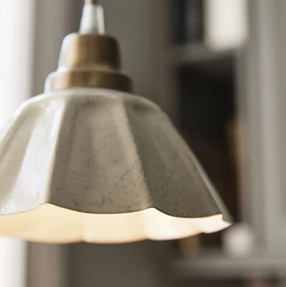 Den runde, åbne lampeskærm på hængelampen Ester i jern har en farvet emaljeret finish. Kombineret med de messingfarvede detaljer over lampeskærmen skaber det en lampe med en tiltalende vintage charme. Strømforsyningen sker direkte via en stikkontakt; hængelampen Ester er derfor udstyret med et stik med fastgørelseskroge.