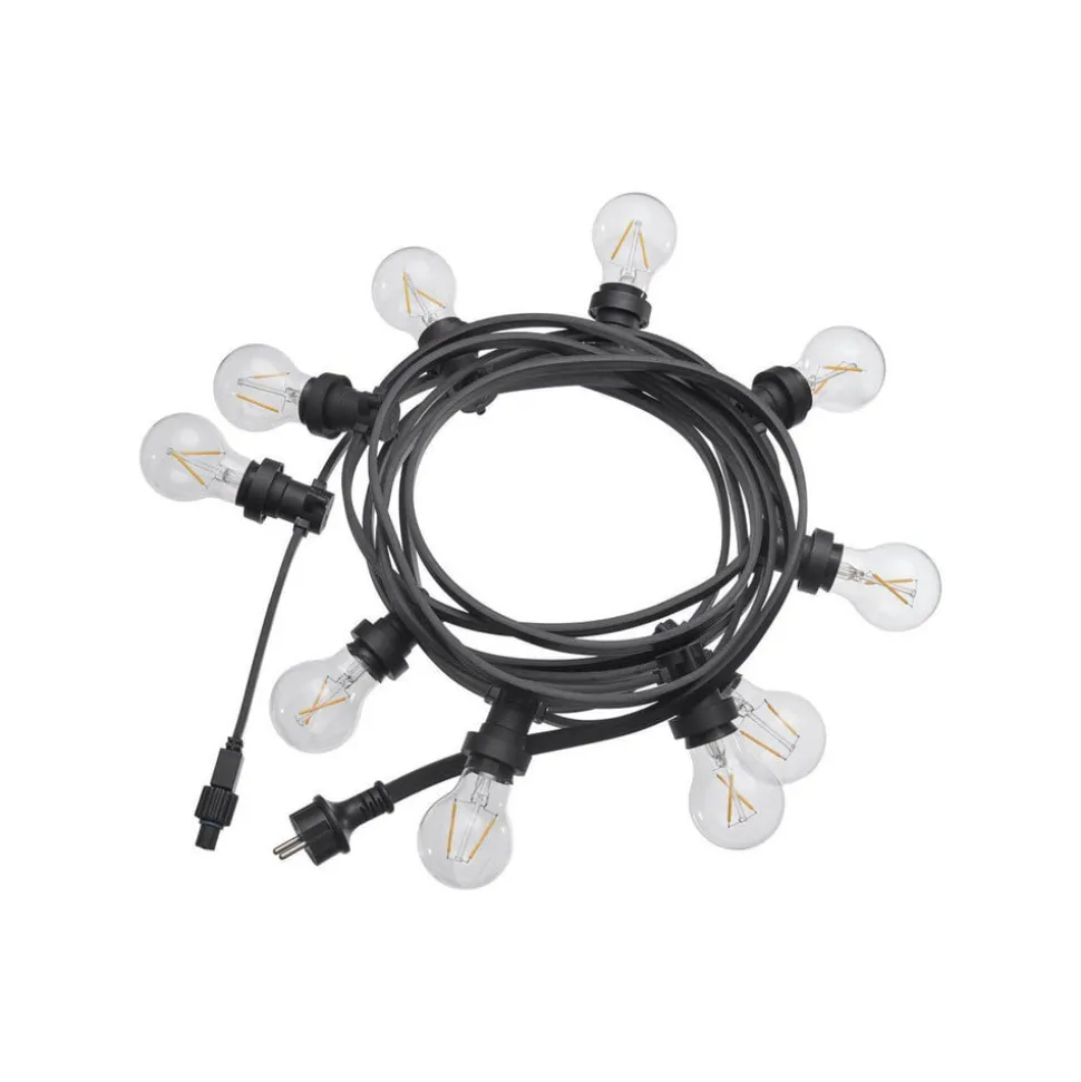 Robust Bright udendørs lyskæde med klare lyskilder Den populære Bright udendørs lyskæde er et startsæt med mulighed for udvidelse. Lyskæden leveres med ti E27 LED-lyskilder. Den har et 230V-stik i den ene ende og en stikkontakt i den anden ende til tilslutning af flere lyskædemoduler, hvis det ønskes. Denne startlyskæde er i alt 7,2 meter lang, og der er 2,5 meter fra stikket til det første lampeudtag. Der kan tilsluttes op til 9 forlængerlyskæder med hver 10 lampeudtag. På den måde kan der skabes et forbindelsessystem med maksimalt 100 lyskilder. Den maksimale belastning for hvert lampeudtag er 15 W. Afhængigt af valget af lyskilde kan udseendet af den almindelige, sorte kæde påvirkes.