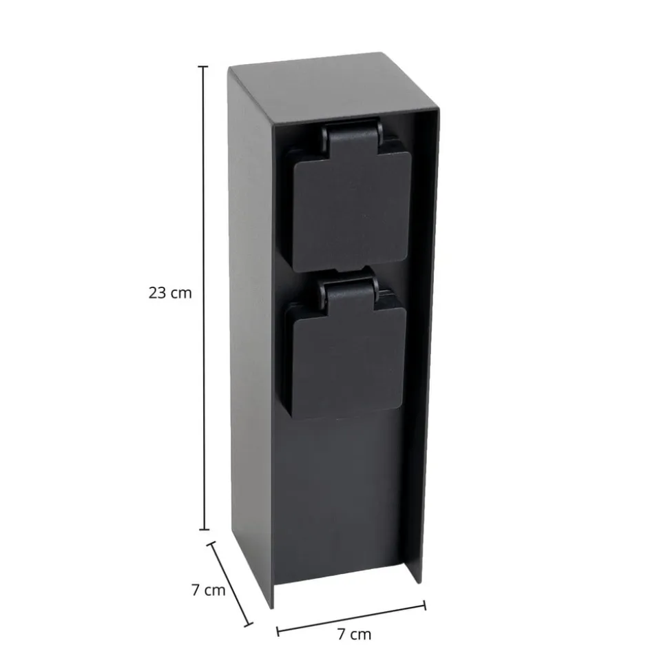 Moderne strømsøjle Foranda i sort med 2 stikkontakter Kroppen på denne stikkontaktsøjle er lavet af rustfrit stål med en sort finish, hvorved designet er meget ligetil og moderne og passer godt til moderne arkitektur. De to stikkontakter er beskyttet af et hængslet dæksel og kan udstyres med forskellige enheder – permanent eller midlertidigt. For eksempel kan haveredskaber forsynes med strøm, men du kan også tilslutte sæsonbestemt dekorativ belysning her om sommeren eller vinteren og belyse haven eller huset smukt udenfor. 2 x CEE 7/3 (maks. 16A/maks. 3600 W)