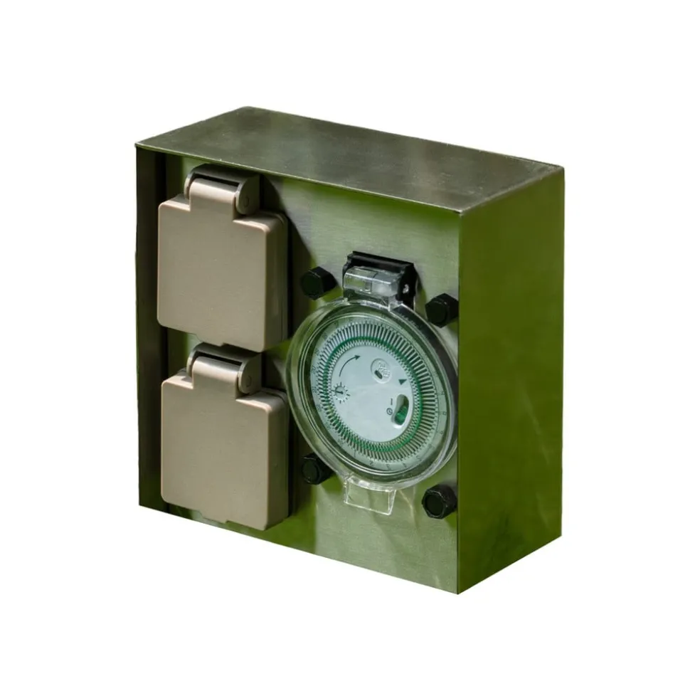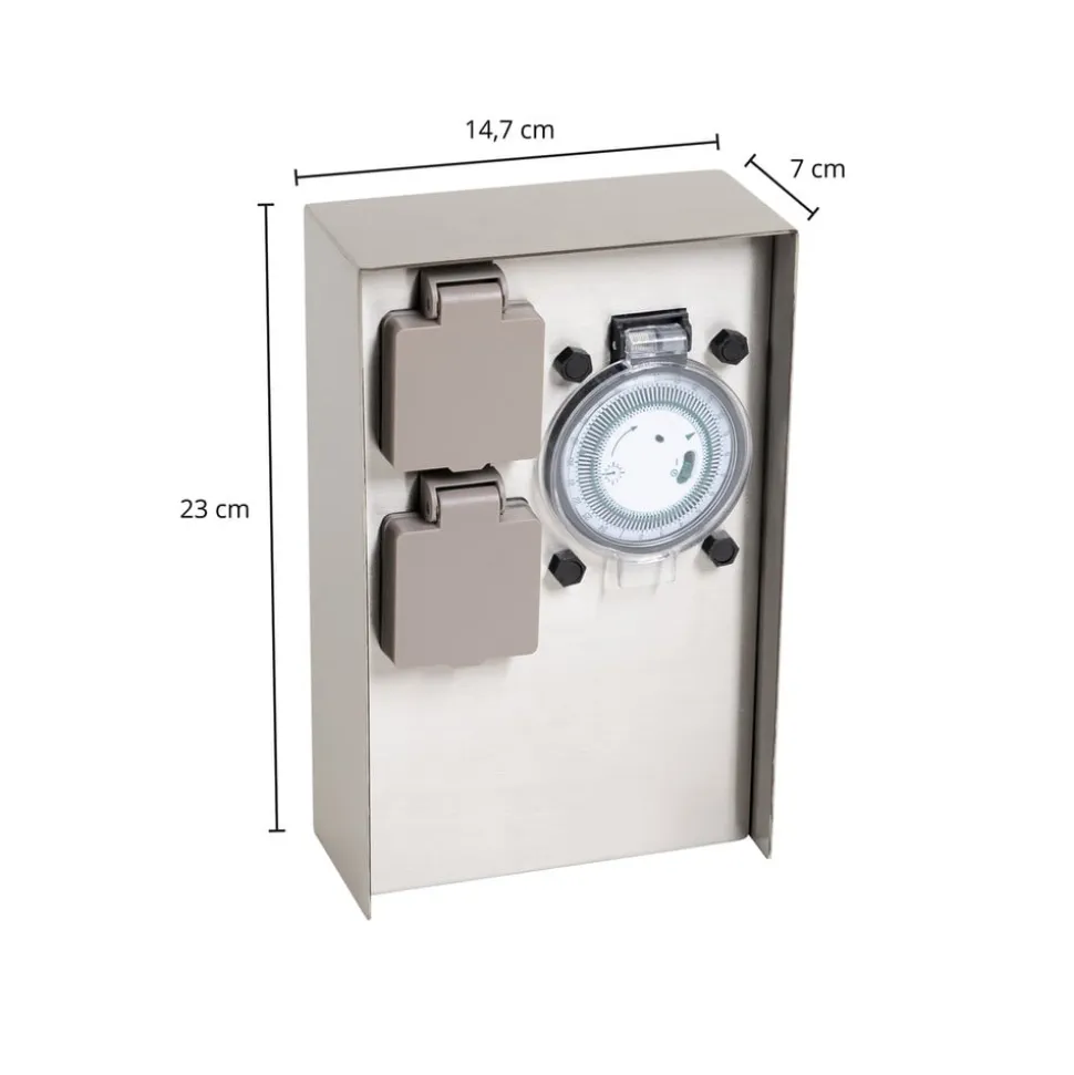 Foranda passer med sit moderne design til moderne udendørs miljøer og er der en pålidelig strømkilde med integreret timer, der kan bruges efter behov til at kunne bruge apparater gentagne gange midlertidigt uden at skulle tænde dem hver gang. Dette er især praktisk, hvis man i en periode ønsker at bruge dekorativ udendørs belysning med stik, som det ofte er tilfældet i juletiden. Med timeren kan lysets varighed og tændingstidspunkt præcist indstilles. Den sorte overflade på det kantede rustfri stålhus er særligt markant og elegant.