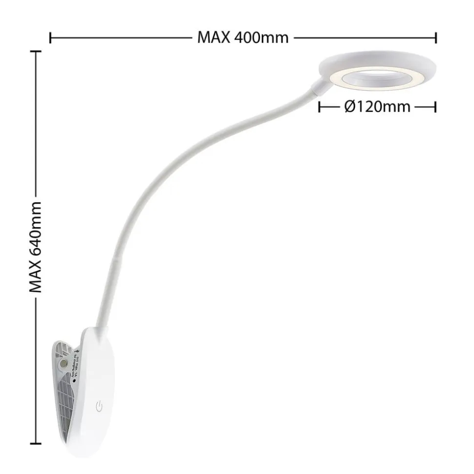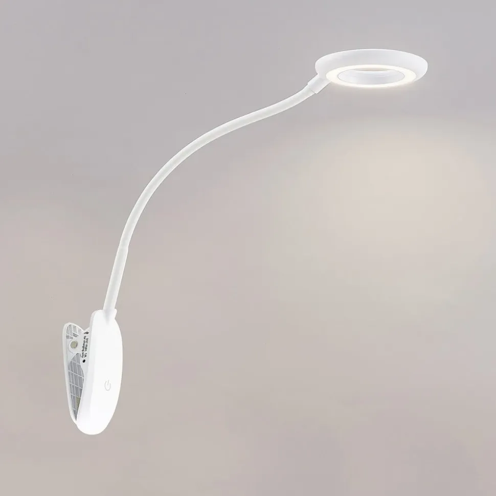 Prios LED-klemmelampe Harumi, hvid, genopladeligt batteri, USB, 51 cm høj