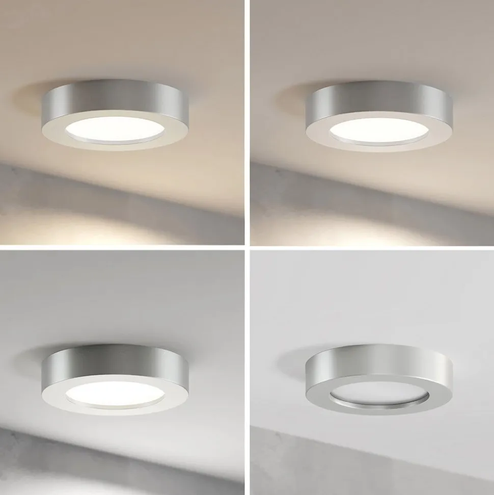 Edwina rund LED-loftlampe med sølvfarvet ramme og kapslingsgrad IP44, forudindstillelig lysfarve – i et praktisk sæt med 3 Denne LED-loftlampe med fastmonterede lysdioder er en klassisk allrounder til mange lejligheder. Med en DIP-kontakt på huset kan man vælge en af tre lysfarver før installation – alt efter hvad der passer bedst til stedet og formålet. LED’erne giver stærkt lys med lavt strømforbrug og er derfor særligt effektive. Hvis det er nødvendigt, kan lysintensiteten justeres ved hjælp af en ekstern dæmper. Derudover giver kapslingsgraden IP44 god beskyttelse mod fugt, hvilket betyder, at Edwina også kan bruges til at oplyse fugtige rum. LED-loftlampen kan med fordel anvendes i både kommercielle og private omgivelser, og det runde design med sølvramme fremstår behageligt diskret og alsidigt. – Forudindstillelig lysfarve (DIP-kontakt) – IP44 kapslingsgrad til badeværelser og fugtige rum – Eksternt dæmpbar – Leveres i et sæt med 3 stk