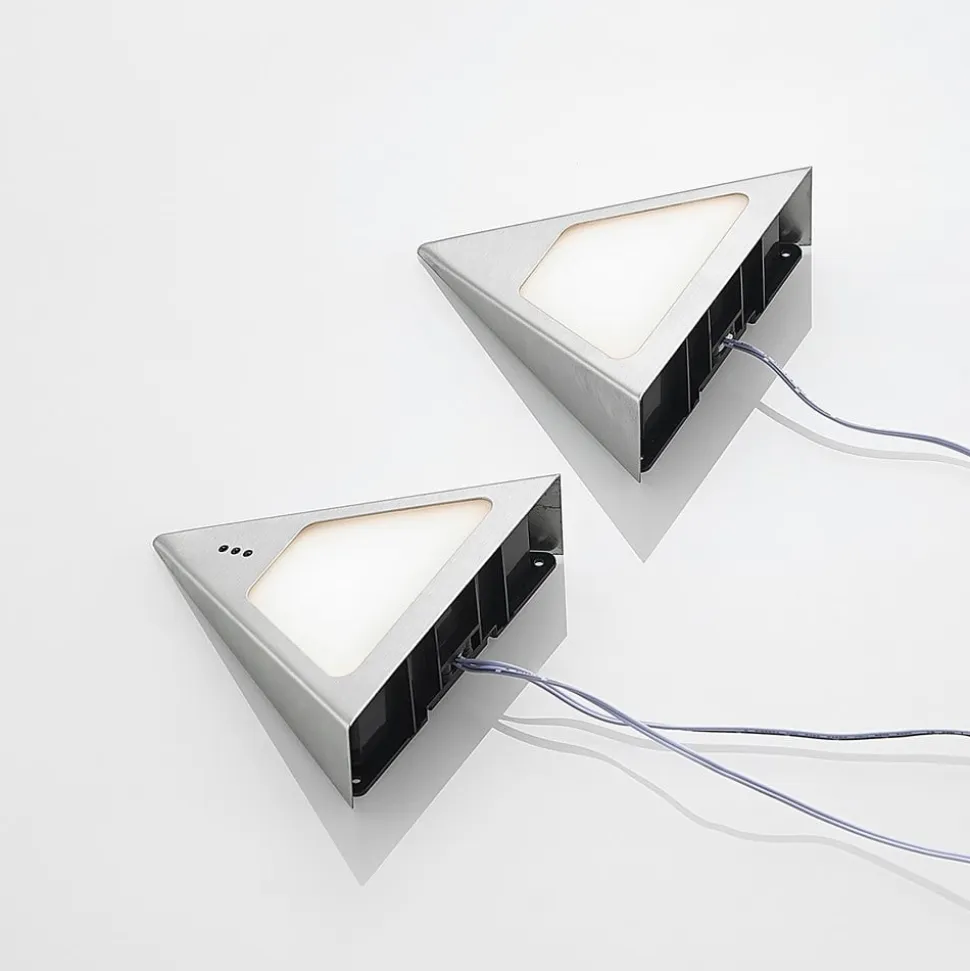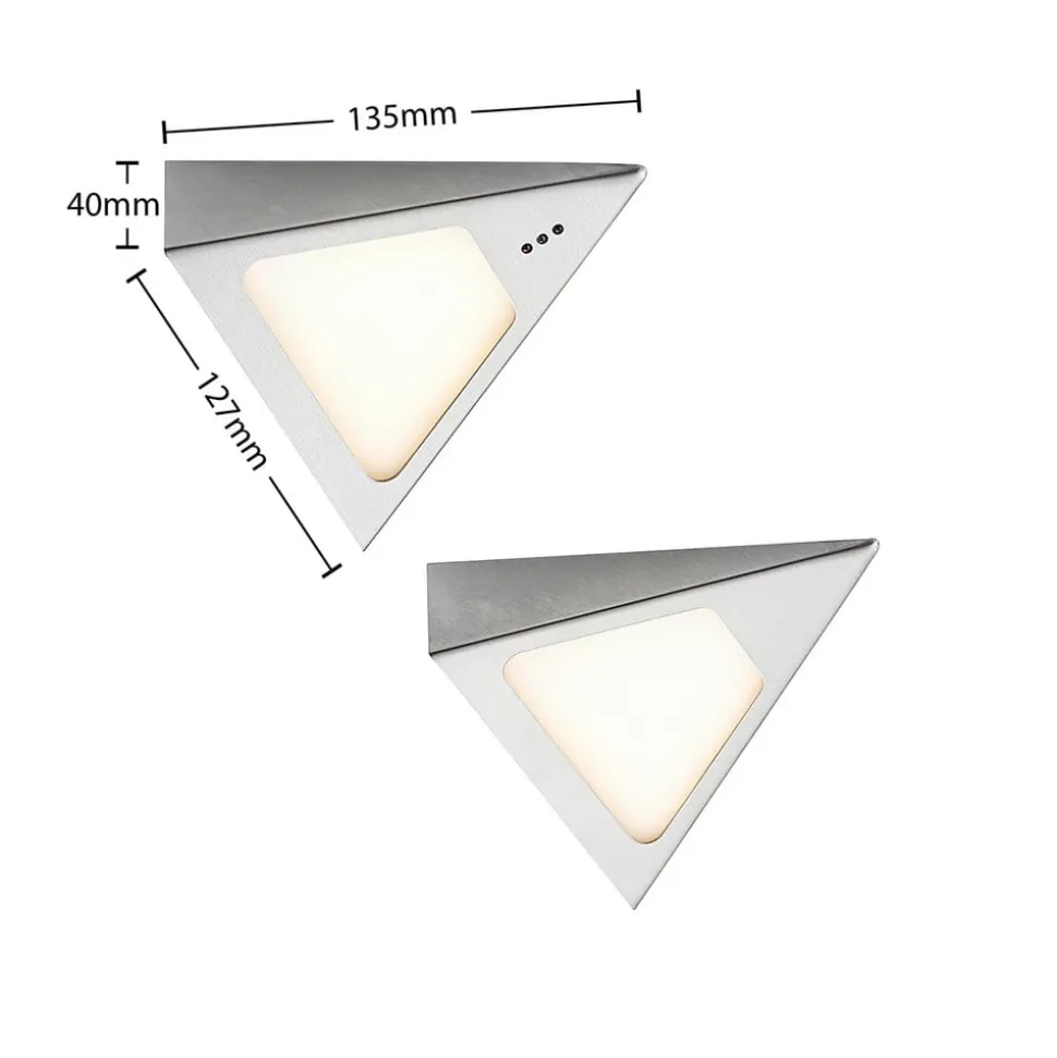 LED-underskabsbelysningen Odia består af to lamper, der er forbundet med hinanden via et kabel. Hvis et møbel skal sættes i et særligt lys, er denne lampe det perfekte valg. Inde i de pyramideformede elementer sidder LED’er, der med deres varmhvide lys skaber en perfekt stemning. Netstikket er forbundet med et to meter langt kabel til det første element, som også er forbundet med det andet element. Kabellængden gør det muligt at placere lampen fleksibelt. LED-underskabsbelysningen Odia kan styres ved hjælp af håndbevægelser og kan tændes og slukkes ved at vinke med hånden. Ved at holde dæmperen inde er den også trinløst dæmpbar. Strømforsyningen er særlig flad, så den nemt kan monteres bag skabe.