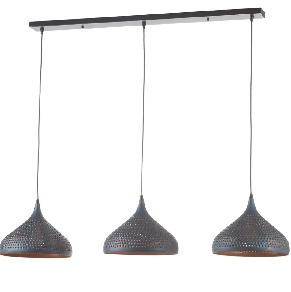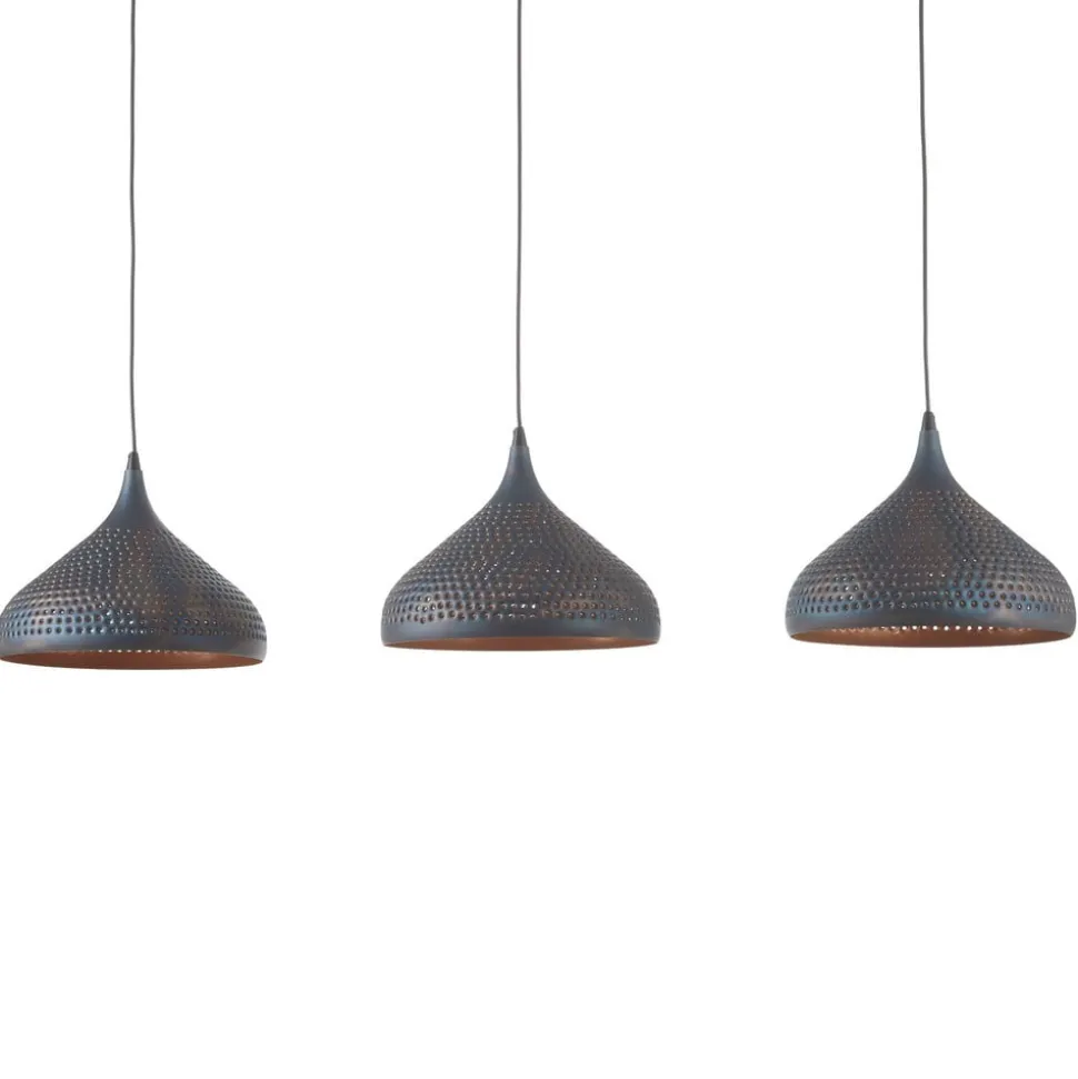 Punchray pendel med tre tragtformede skærme Med tre skærme hængende på række er Punchray særligt velegnet til belysning af langborde. Her giver de nedadgående skærme i form af omvendte tragte direkte lys, mens de utallige huller, der løber gennem metallet, skaber stemningsfulde strålemønstre. Den sortbrune pendels dekorative karakter kan fremhæves med spejllamper, globelamper eller rustikke lamper ved at skabe en varm glød på indersiden af skærmen.