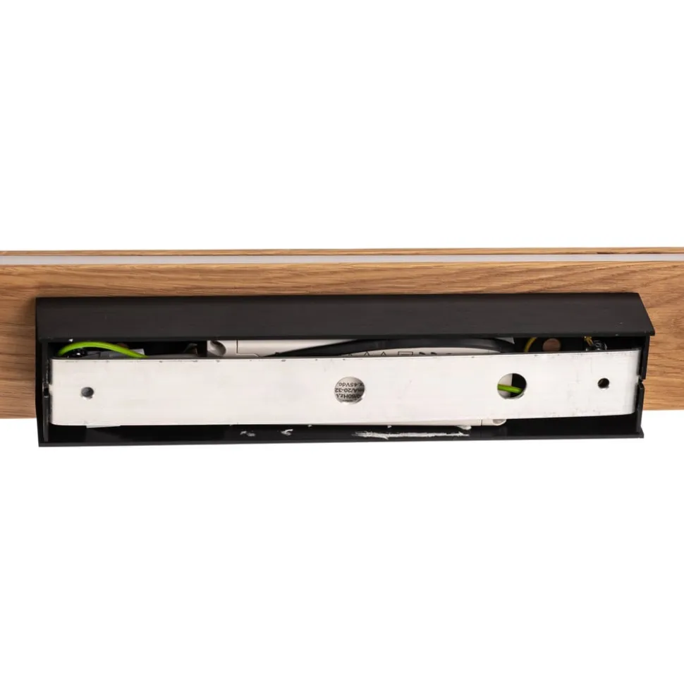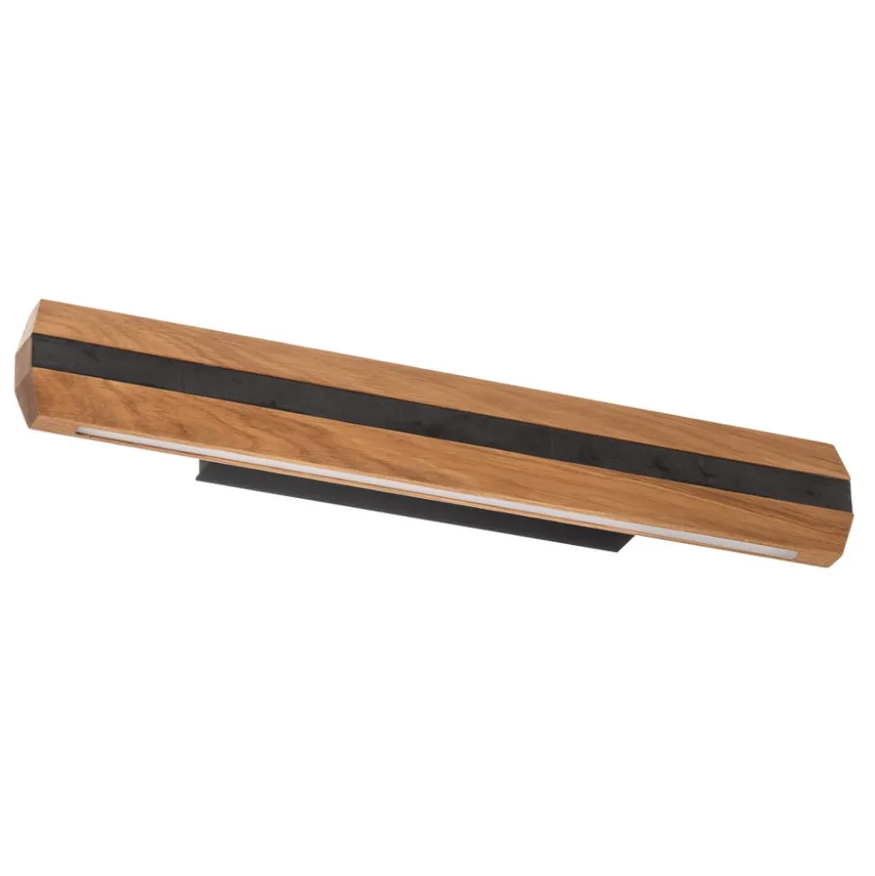 Elis LED-væglampe af massivt egetræ med op- og nedlys Elis-væglampen er lavet af egetræ, hvilket giver den et naturligt og varmt udseende. Der er også en sort dekorativ stribe af aluminium i midten af skærmen, som giver væglampen et ekstra moderne touch og afrunder designet perfekt. Overfladen er omhyggeligt udformet i hånden og giver væglampen et individuelt look. Elis har indirekte op- og nedadrettet belysning, som skaber en hyggelig atmosfære i rummet. Belysningen skaber også en smuk lyseffekt på væggen. Lysstyrken kan justeres individuelt ved hjælp af en ekstern fasedæmper. Kompatible fasedæmpere: – BERKER 2874 – BUSCH 65234 – GIRA 238500 – JUNG 225TDE