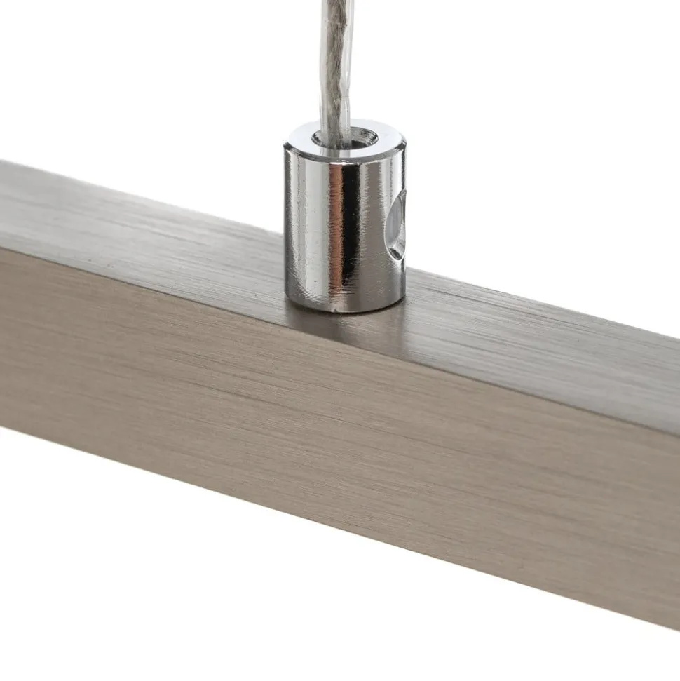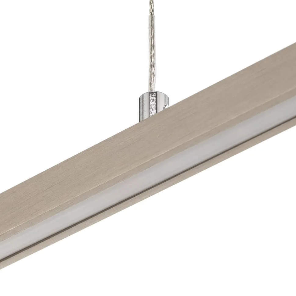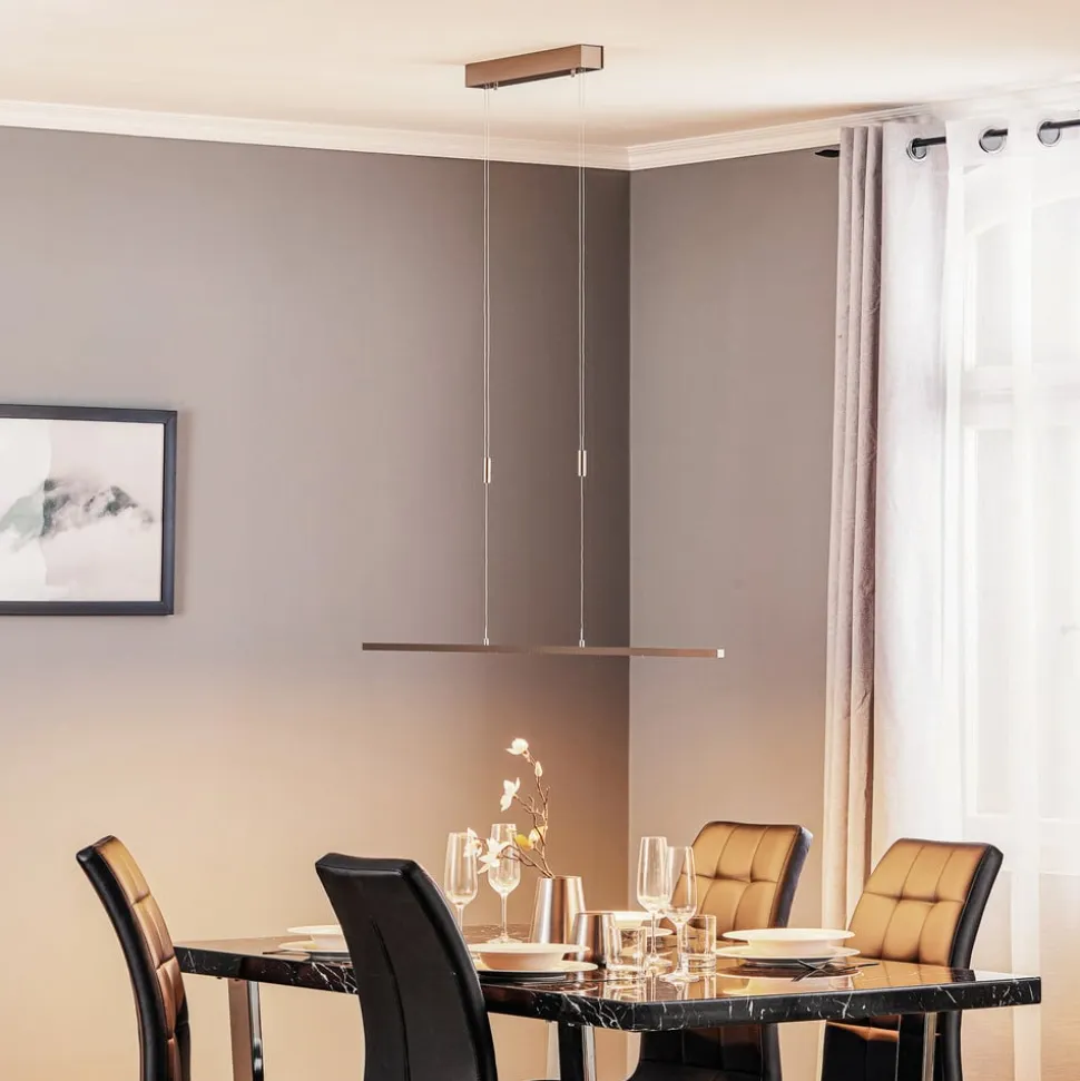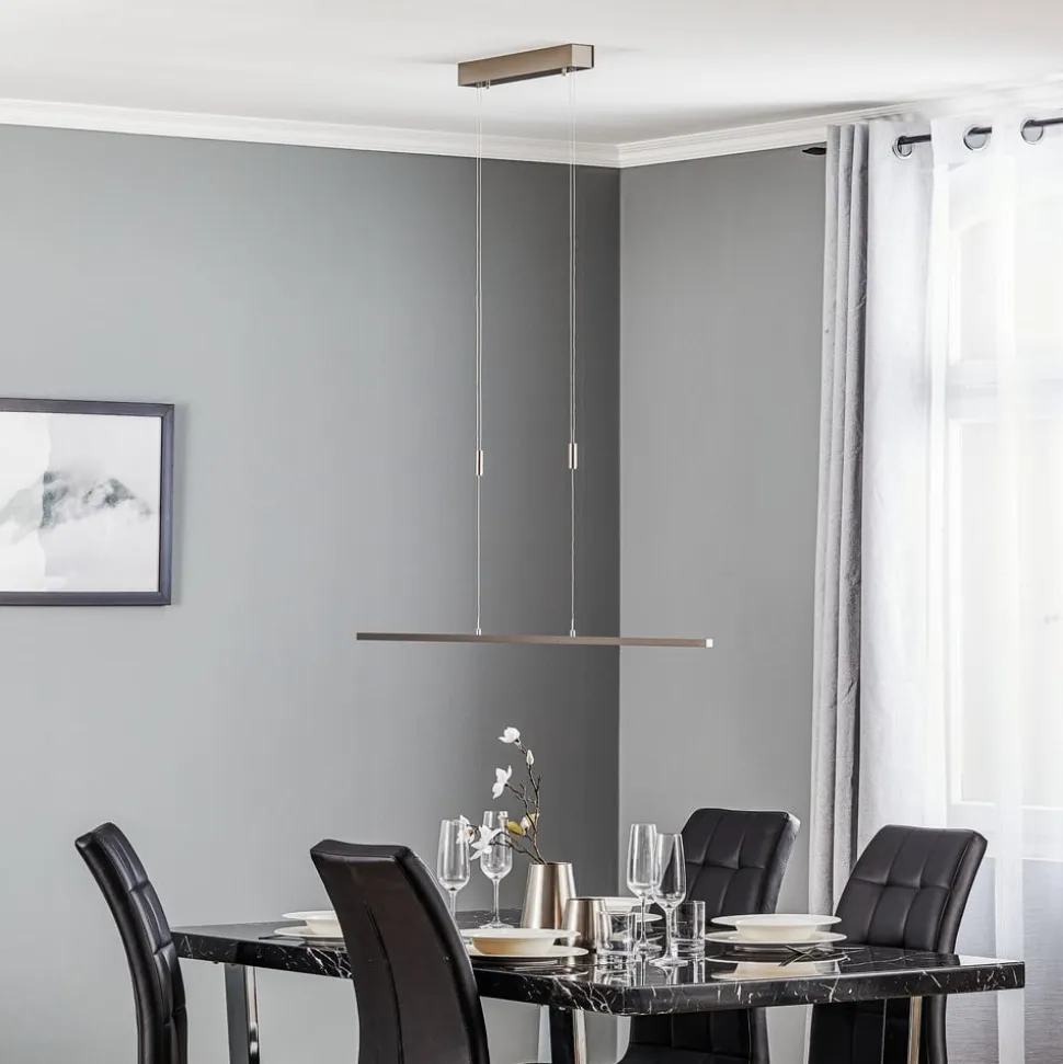Elegant Tolu LED-pendel i et tiltalende og puristisk slankt design, højdejusterbar, fremstillet i Tyskland Tolu-pendlen er perfekt til at belyse et bord klart og effektivt. Den har ingen skærm, men en filigran og minimalistisk lysstang i et slankt design, som er udstyret med en kontinuerlig stribe af varmhvide LED’er på undersiden, hvis lysfarve svarer til klassiske pærer. LED’erne er ikke bare meget effektive, de kan også dæmpes eksternt efter behov med en leading edge- eller trailing edge-fasedæmper. Lyset er flimmerfrit og derfor særligt behageligt, og højden kan til enhver tid justeres under drift, fra 105 cm til 195 cm. Det gør det muligt at tilpasse lyset optimalt til forholdene på stedet og til omgivelserne og de personlige behov på forskellige måder. Den nikkelfarvede overflade på den eksklusive LED-pendel af høj kvalitet er omhyggeligt bearbejdet i hånden og har en elegant børstet finish med et sofistikeret look og en moderne effekt. Et ekstra stort tilslutningsrum i loftsdåsen gør det nemt at installere LED-pendlen, og alle kabler og elektriske materialer kan nemt gemmes væk. Lampens puristiske design er også et førsteklasses kvalitetsprodukt, der er fremstillet i Tyskland efter de højeste standarder.